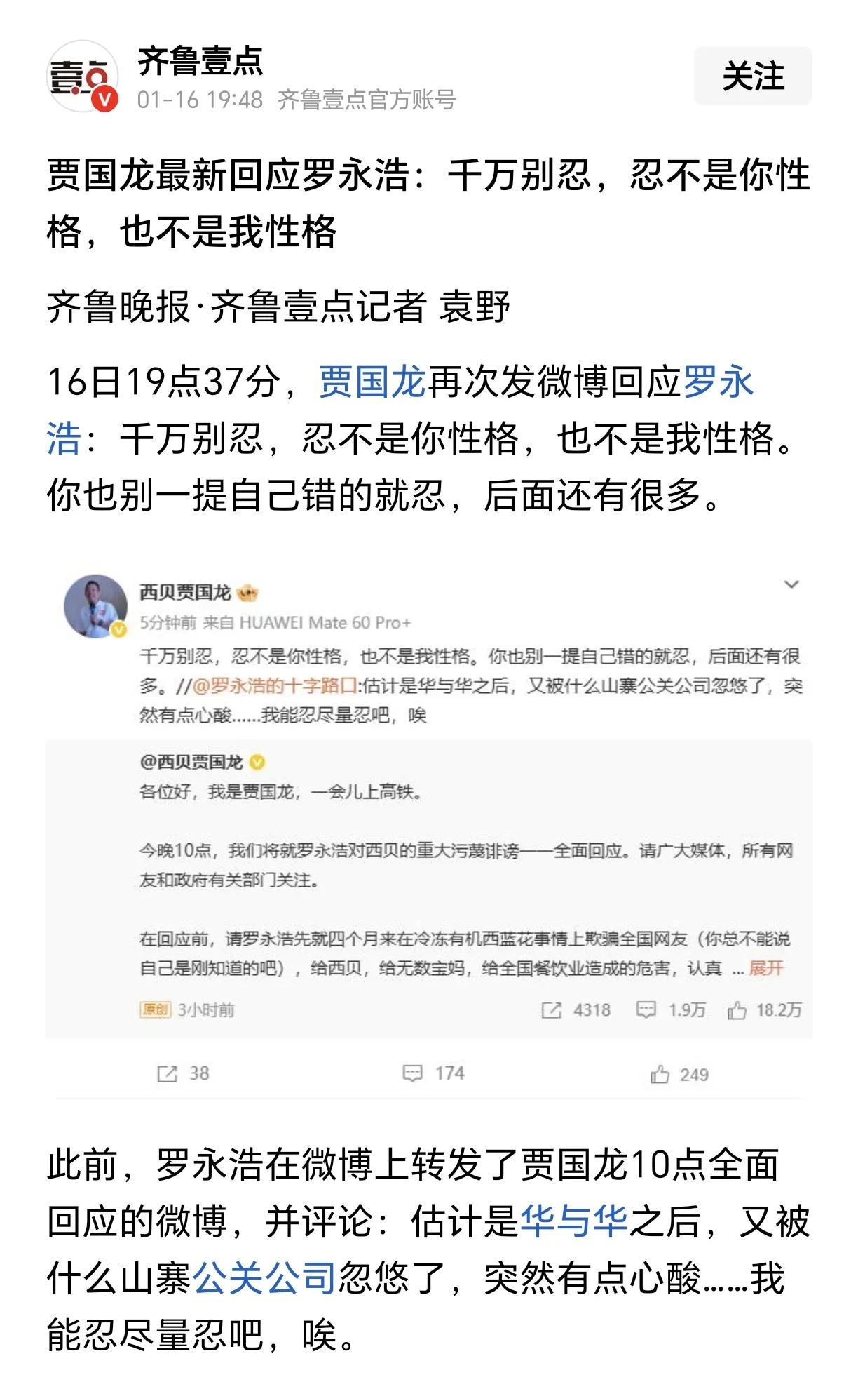 “贾国龙称,在回应前,请罗永浩先就四个月来在冷冻有机西蓝花事情上欺骗全国网友(你总不能说自己是刚知道的吧),给西贝、给无数宝妈、 给全国餐饮业造成的危害,认真道歉,并赔偿相应损失。” 西贝贾老板手撕罗永浩的故事还在继续,真的佩服贾老板的硬气程度,即使走到今天被顾客抛弃、上百门店关门了,仍然觉得是所有错误都源于罗永浩当初就餐后发的那条吐槽微博。 不过也难怪,现在西贝要上市是不可能了,贾老板想在把西贝运营上市后套现的美梦破裂了,能不委屈吗。 西贝贾老板 老罗西贝大战