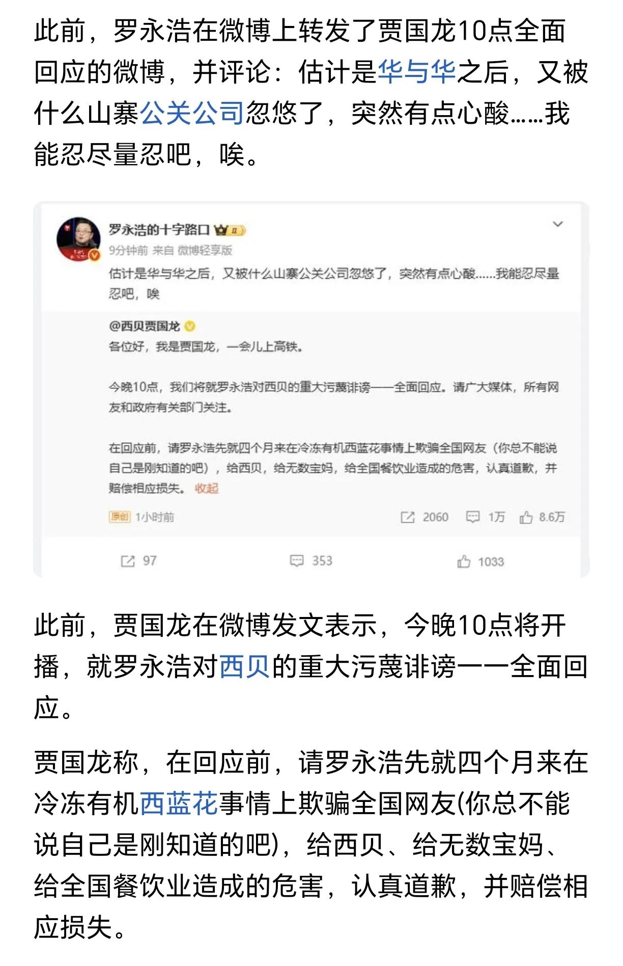 “贾国龙称,在回应前,请罗永浩先就四个月来在冷冻有机西蓝花事情上欺骗全国网友(你