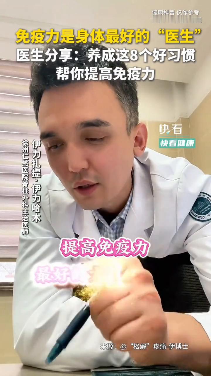 免疫力是身体最好的"医生",医生分享:养成这8个好习惯帮你提高免疫力。 徐州仁慈医院脊柱外科主治医师伊力扎提。 提高免疫力最好的方法是什么? ·1.每天吃一个苹果。 ·2.每天吃两个鸡蛋。 ·3.多运动。 ·4.多晒太阳。 ·5.睡前热水泡脚。 ·6.保持心情舒畅。 ·7.好好睡觉。 ·8.准时吃饭。 免疫力 增强自身免疫力 免疫力饮食 免疫力提升 免疫力提升攻略 预防免疫力下降 免疫力提升食谱