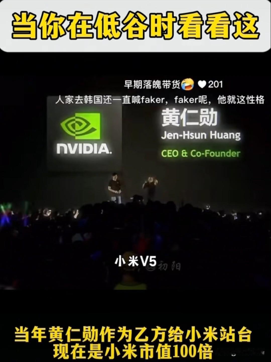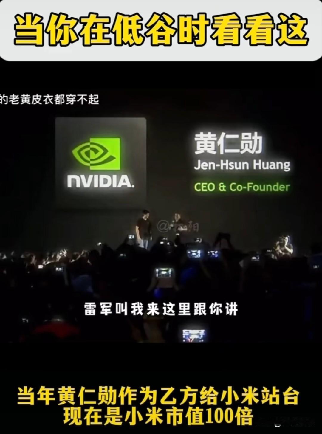 估计很多人没看过这段视频,谁能想到如今不可一世的科技巨无霸掌门人黄仁勋也给小米站过台,在雷布斯面前,语气还有点“谦卑”。 在这段视频里语气谦和,黄仁勋甚至略带青涩。那时的英伟达还在移动芯片领域摸索,小米则是初生牛犊。短短十余年,两人各自引领革命——一个成为AI教父,一个重塑制造生态。 这段“谦卑”过往,恰是科技史上最动人的注脚:浪潮之巅的巨人,都曾默默趟过同一条时间的河流。 (图片来源于网络) 黄仁勋 小米