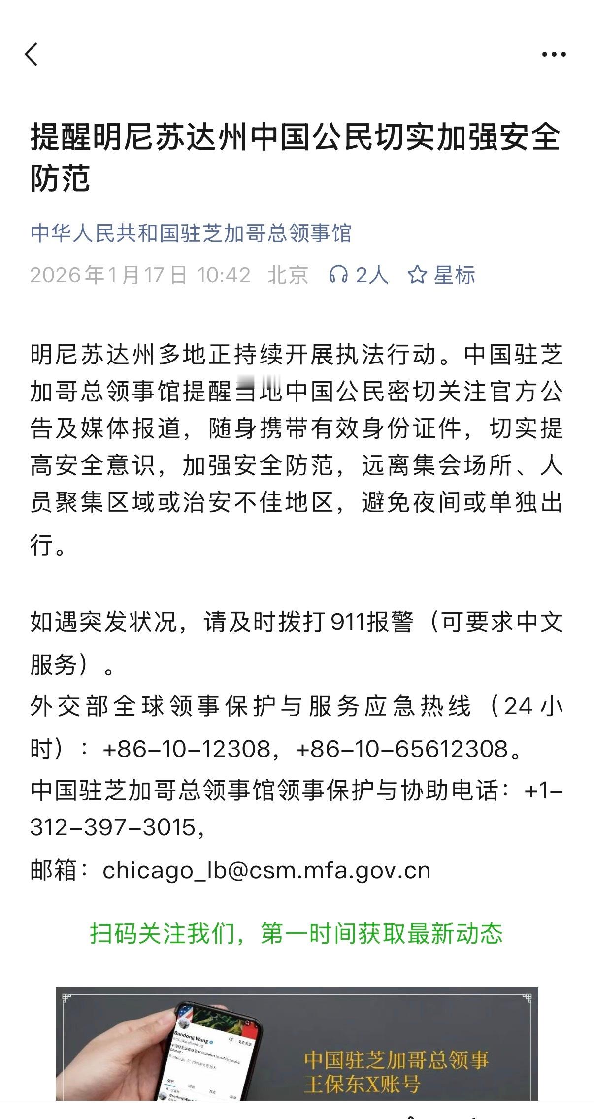 🔻我驻芝加哥总领事馆提醒明尼苏达州的中国公民切实加强安全防范。特朗普称明尼苏达州已完全失控海外新鲜事国际局势热点现场