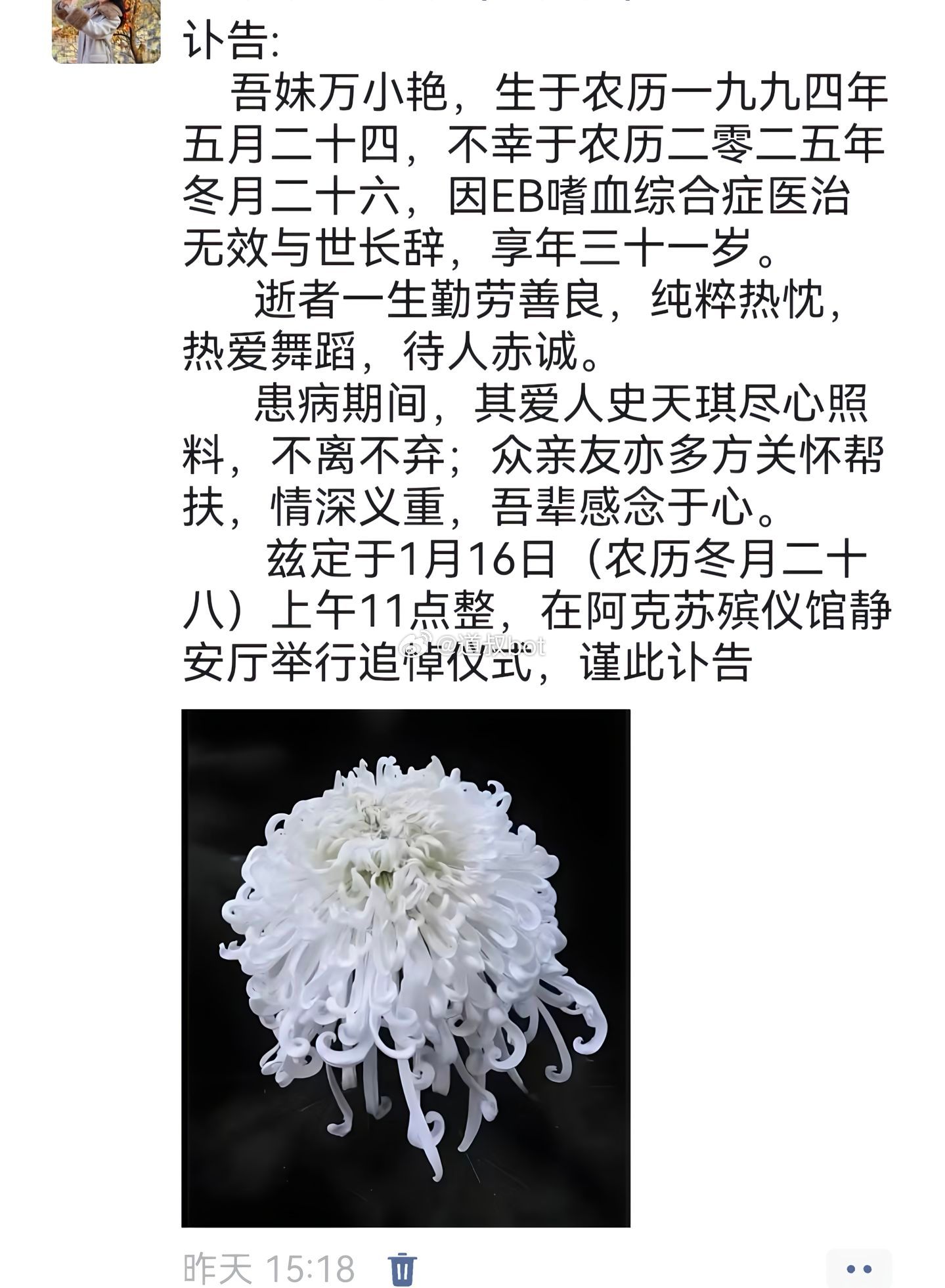 新疆31岁舞蹈老师万小艳,因患EB嗜血综合症,从确诊到离世仅2个月,丈夫卖车卖房治病,坦言:不后悔,家人发讣告:愿天堂没有疾病。
