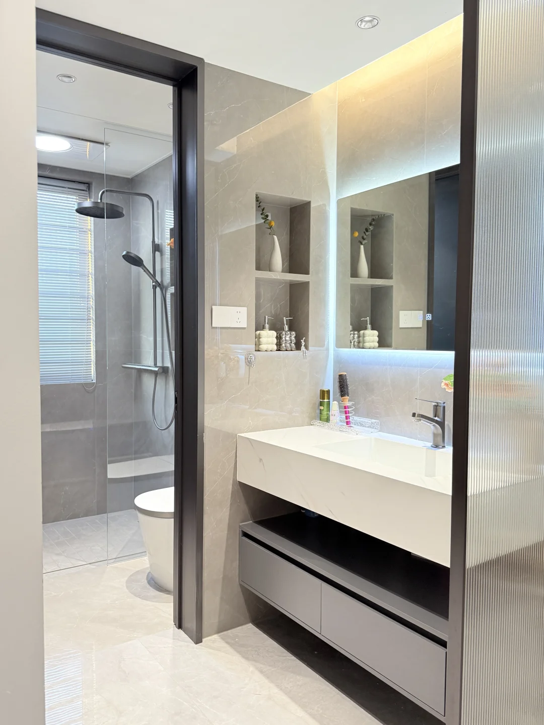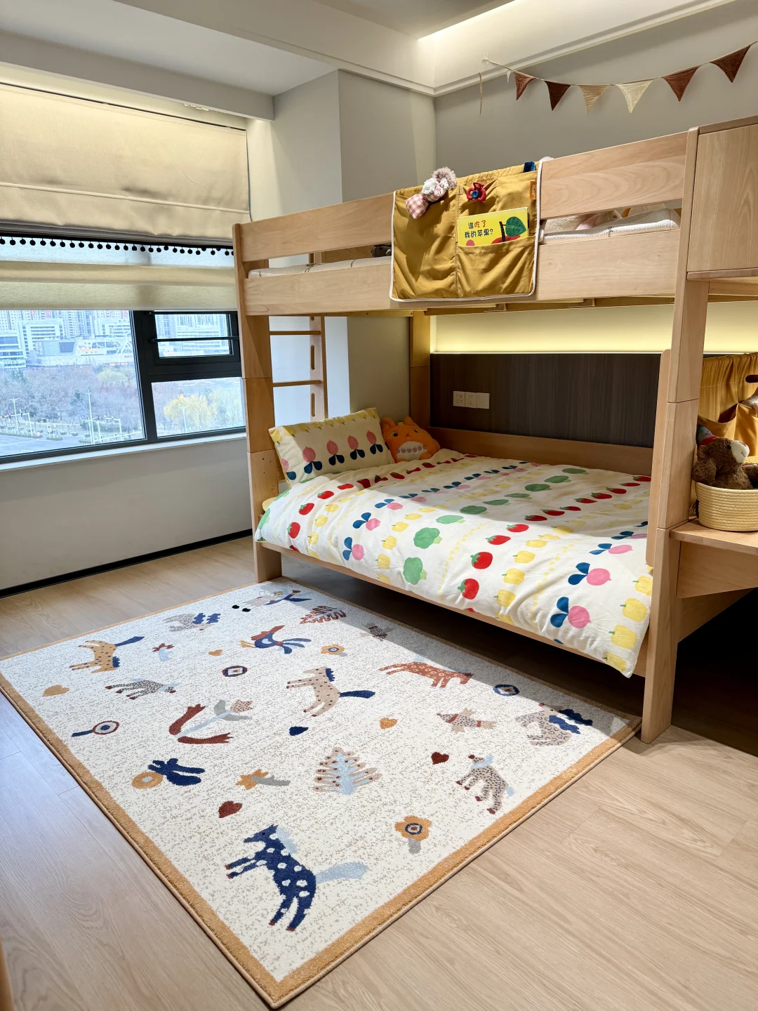 🏠哈喽,这里是小石头的家 建筑面积140平,套内120平!普通人的小家~入住两年,真的是越住越爱! ✅2.6米的餐厅开间,做了一整面墙的餐边柜。浅色柜门搭配木纹色的柜子,极简又耐看!2.8米的长度做了两扇玻璃柜门,整体更协调! ✅放了一个1.8米的洞石岩板餐桌,仿石材的纹理,高级感满满!胡桃木的桌腿,和餐边柜也很呼应!细节感更是拉满了,加厚岩板,耐磨耐用!颜值也很在线,朋友来家里都直呼,太高级了~ ✅客厅更是简简单单,4.5米的开间,没做费钱的工艺,公区通刷的乳胶漆,选择了无主灯吊顶,很显空间大!悬浮的电视背景墙,搭配85寸电视,省钱又耐看! ✅4平米的卫生间,做了干湿三分离!陶瓷岩板的浴室柜,极简又大气。淋浴区做了下沉式的设计,不磕绊的同时,极简又高级! 🧸儿童房布置成孩子们喜欢的设计,一个上下床搭配童趣十足的地毯,卡通图案的造型,孩子超喜欢!还是无胶防水的,放在儿童房就很放心~把家装成自己喜欢的样子餐边柜现代简约家的样子我的装修记录餐厅餐边柜硬装越简单家里越显大卧室卫生间