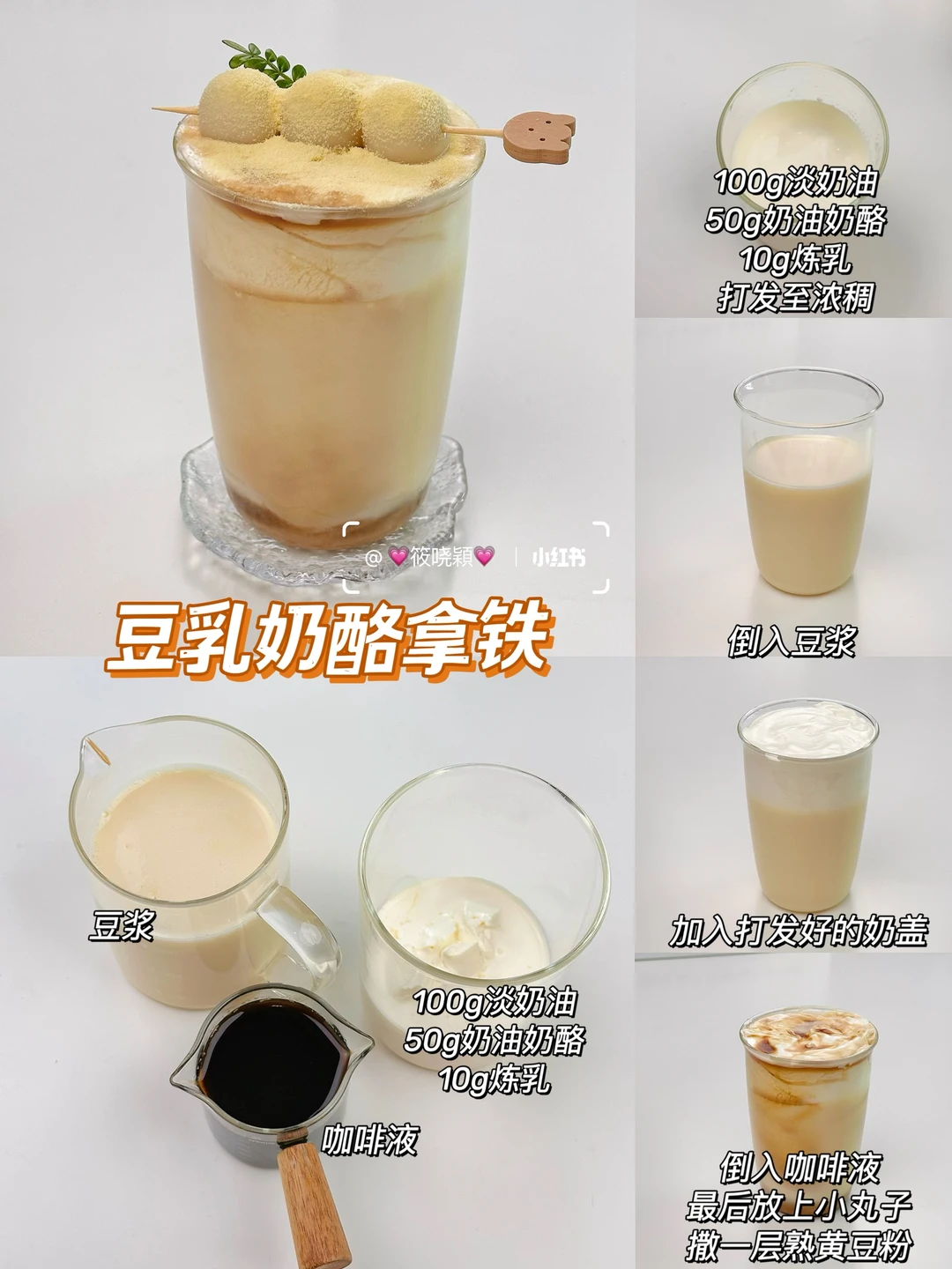 ②杯中倒入豆浆7分满,再倒入奶盖9分满