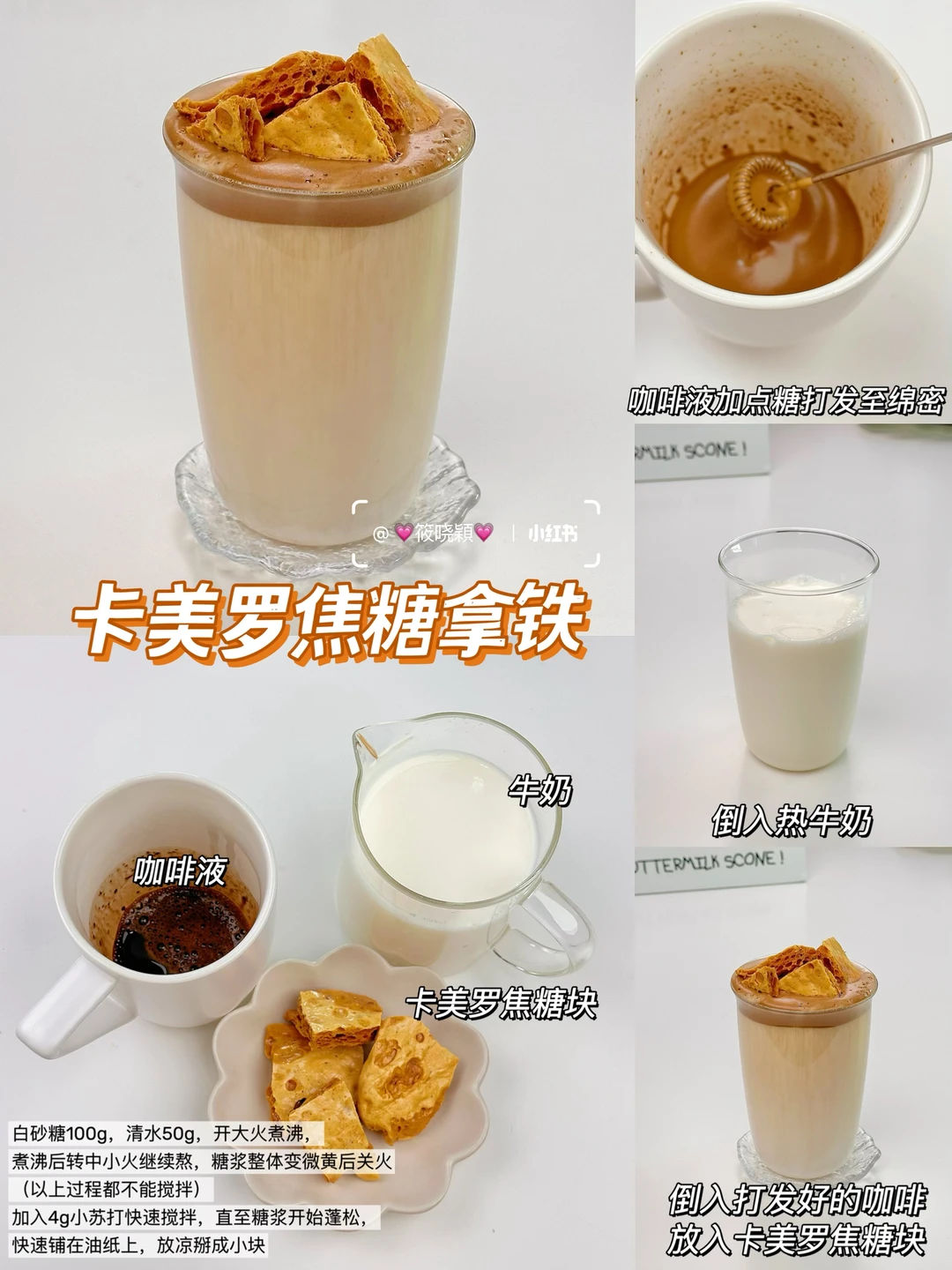 卡美罗做法:白砂糖100g,清水50g,开大火煮沸,煮沸后转中小火继续熬,糖浆整体变黄后关火(以上过程全程都不能搅拌)加入4g小苏打后快速搅拌,直至糖浆开始蓬松,快速铺在油纸上,放凉掰成小块