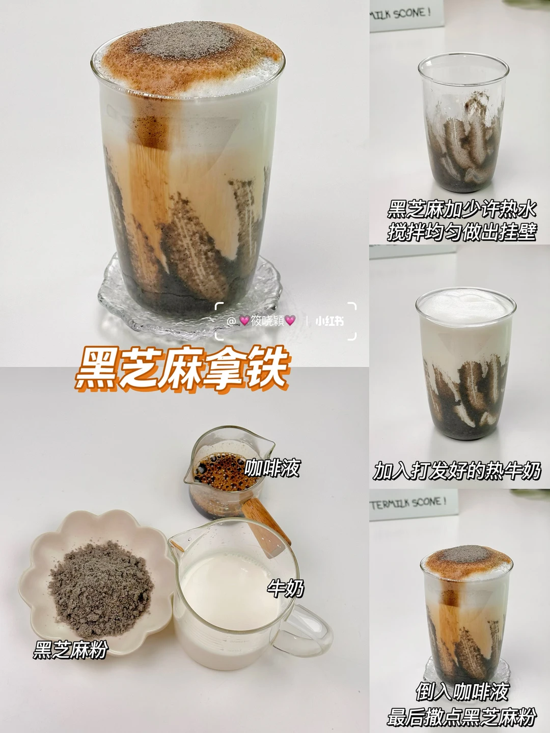 ②倒入打发好的热牛奶,倒入咖啡液,撒点黑芝麻粉装饰
