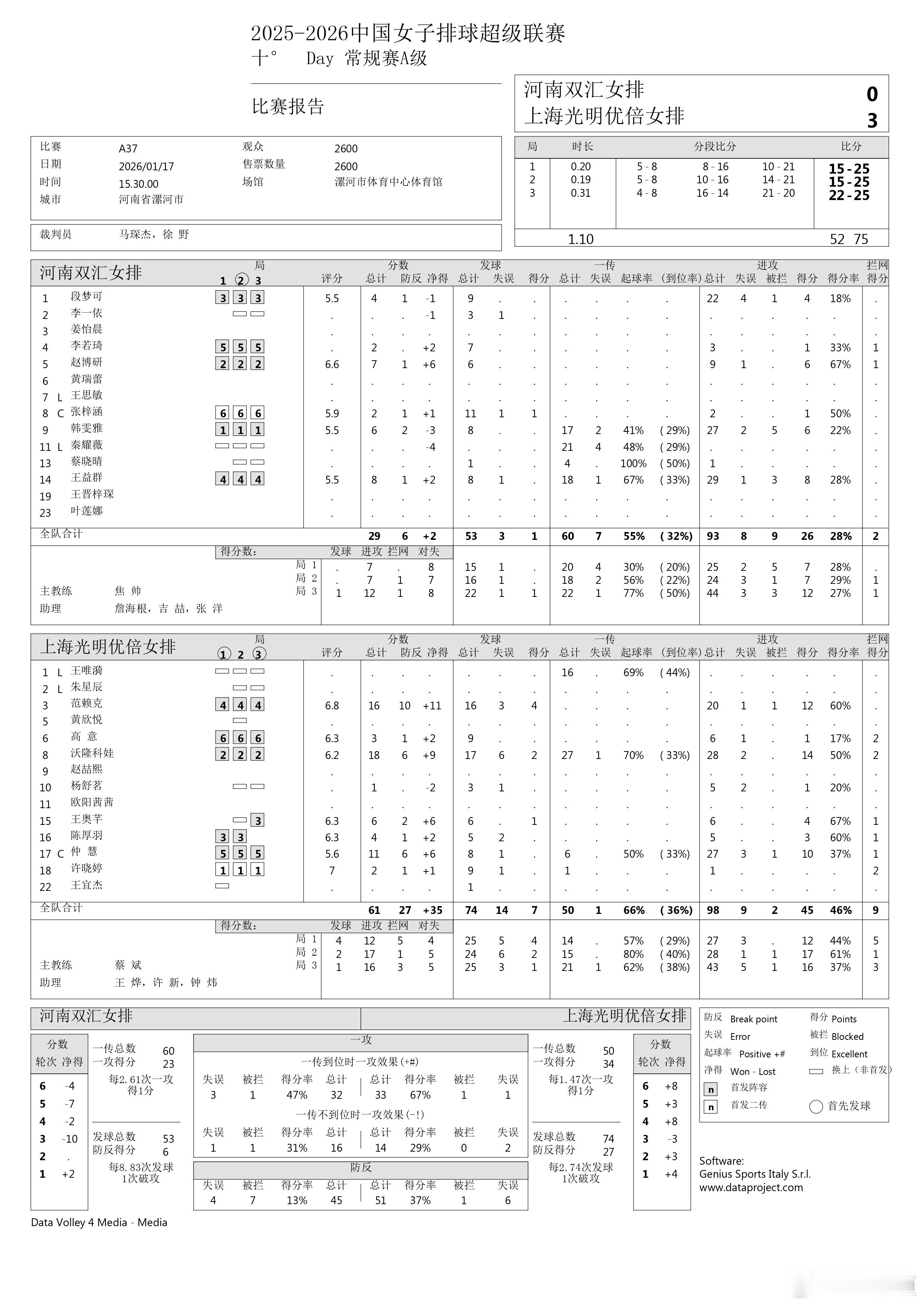 排超联赛2025-2026赛季中国排球超级联赛 女排常规赛A级第10轮比赛,河南双汇主场0-3(15-25/15-25/22-25)上海光明优倍;河南女排的边攻都是啥进攻成功率魔女两外援共砍下34分,沃隆科娃18分,范赖克16分段梦可22扣4中4失误1被拦,韩雯雅27扣6中2失误5被拦;王益群29扣8中1失误3被拦