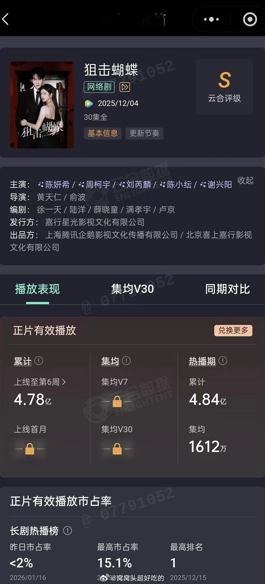 狙击蝴蝶热播期结束,最终集均1612万!绝对是小成本爆剧,红利多多啊