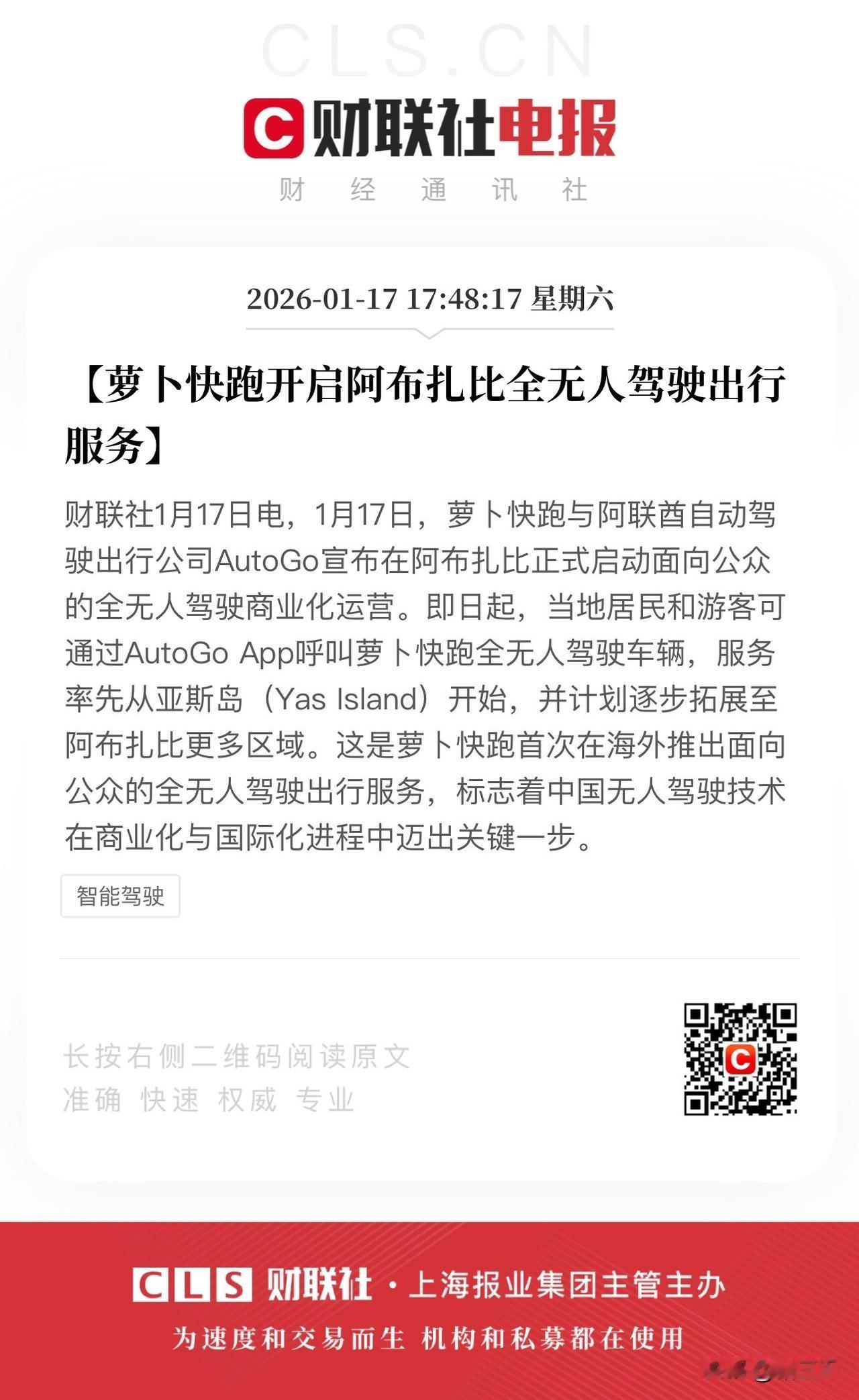 2026A股主线之一智能驾驶风正劲! 萝卜快跑在阿布扎比落地生根, 推出全无人驾驶出行服务。 萝卜快跑一直是Uber的最有力竞争者, 后来又成为Uber的战略合作伙伴, 一起扩展中国和美国以外的大市场! 在武汉试验田跑通以后, 迅速抢占海外市场, 有利于让中国智驾标准迅速抢占高地! 萝卜快跑依托百度智驾算法, 在全球覆盖22座城市, 自动驾驶总里程达到了2.4亿里, 其中完全无人驾驶里程突破1.4亿里。 过去20年互联网每一个战略风口, 百度都是精准踩中了, 但是手机、电商、金融都没发展起来, 这一次能否一鸣惊人呢? 国内最大的竞争对手是华为, 目前华为在全球市场被美国上了紧箍咒, 所以百度萝卜快跑能很好的补位! 希望这些优秀的中国企业, 有朝一日能称为世界级公司笑傲山巅。 …