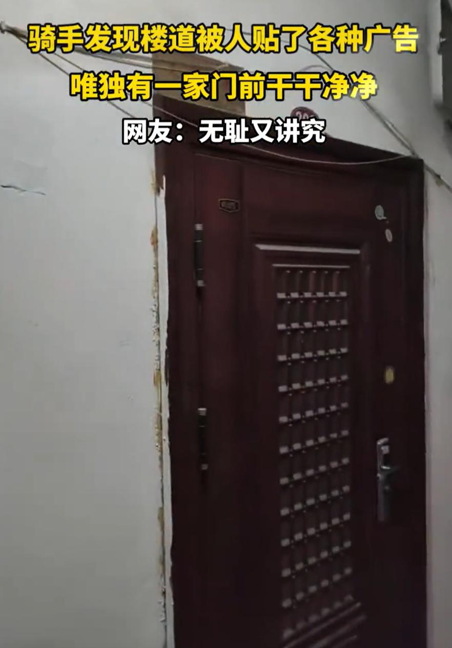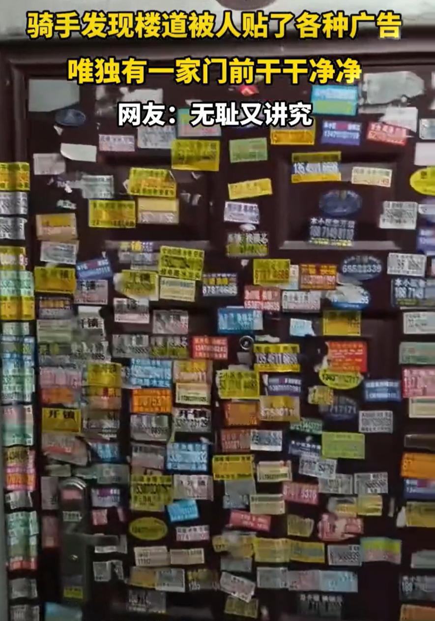这下解释不清了!一位骑手到老小区送餐,不过准备离开时,却突然发现一个有趣的现象,同一层楼里,有3家的门上都贴满了小广告,唯独一家干干净净的,而且还是“光荣之家”。网友:无耻又讲究 从骑手拍摄的视频来看,这个楼道一层是4户人家,其中左右两侧的入户门都被贴满了小广告,甚至墙面和水管上都已经被贴满,可中间一户“光荣之家”却显得有些不合群,他们家不仅门上一个小广告都没有,就连两边的墙壁上都没有,这让骑手觉得很意外 对此,有网友说:光荣之家,基本都是军人的家,受人尊重 但也有网友表示:其实他们没有那觉悟,这就是破窗效应!门上有一个没撕下来就会有人贴第二个,然后无数个,如果不允许第一个存在就一直干净 这事儿听起来小,却挺耐琢磨 我自己住的也是老小区,对门上的小广告深有体会。有时候出门两天,回来门上就多出好几张疏通管道、开锁换锁的贴纸。清理起来费劲,不清理又心烦。时间一长,有些邻居干脆不管了,结果整扇门成了“广告栏”,更没人愿意去碰 所以看到那户“光荣之家”能保持干净,我第一反应不是觉得贴广告的人格外讲道德,而是想到:这家人平时肯定维护得很勤 那种干净,不是偶然的,而是一种习惯。可能他们每次看到有张贴纸冒头,就随手撕掉了;可能他们家的门漆比较新,贴纸不容易粘牢;也可能他们和邻居关系不错,偶尔还会帮忙清理隔壁的门。总之,门上没有“第一张”,就不会有后来的无数张 当然,也不是说贴小广告的人就完全看人下菜。也许他们贴的时候,看到“光荣之家”的牌子,手底下确实犹豫了一下。人心里总有一些朴素的敬意,哪怕是在这样细微的事上。但这应该不是主要原因——更关键的是,那扇门始终没给他们“可以贴”的机会 楼道被人狂贴广告 唯独一家幸免
