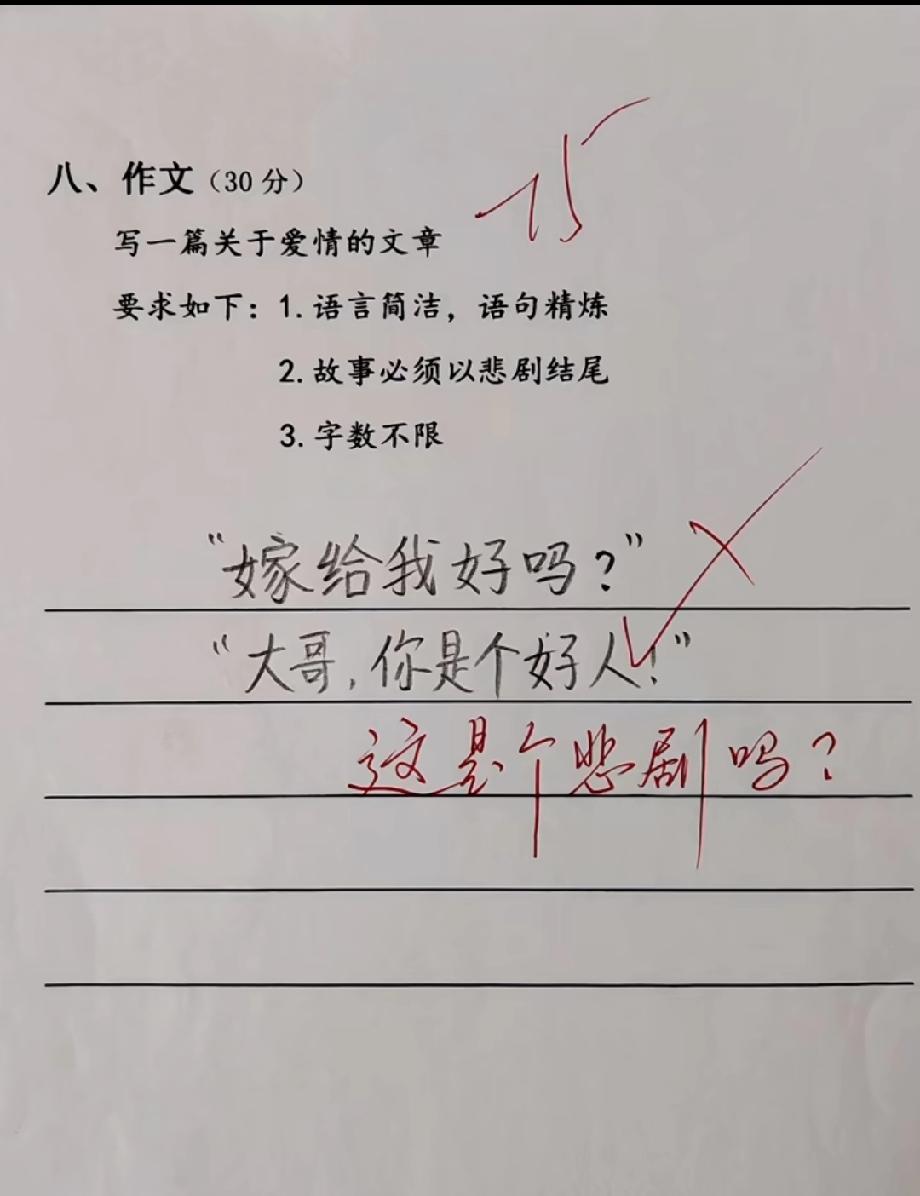 老师要悲剧爱情作文,学生直接写“你是个好人”,老师看懵了!