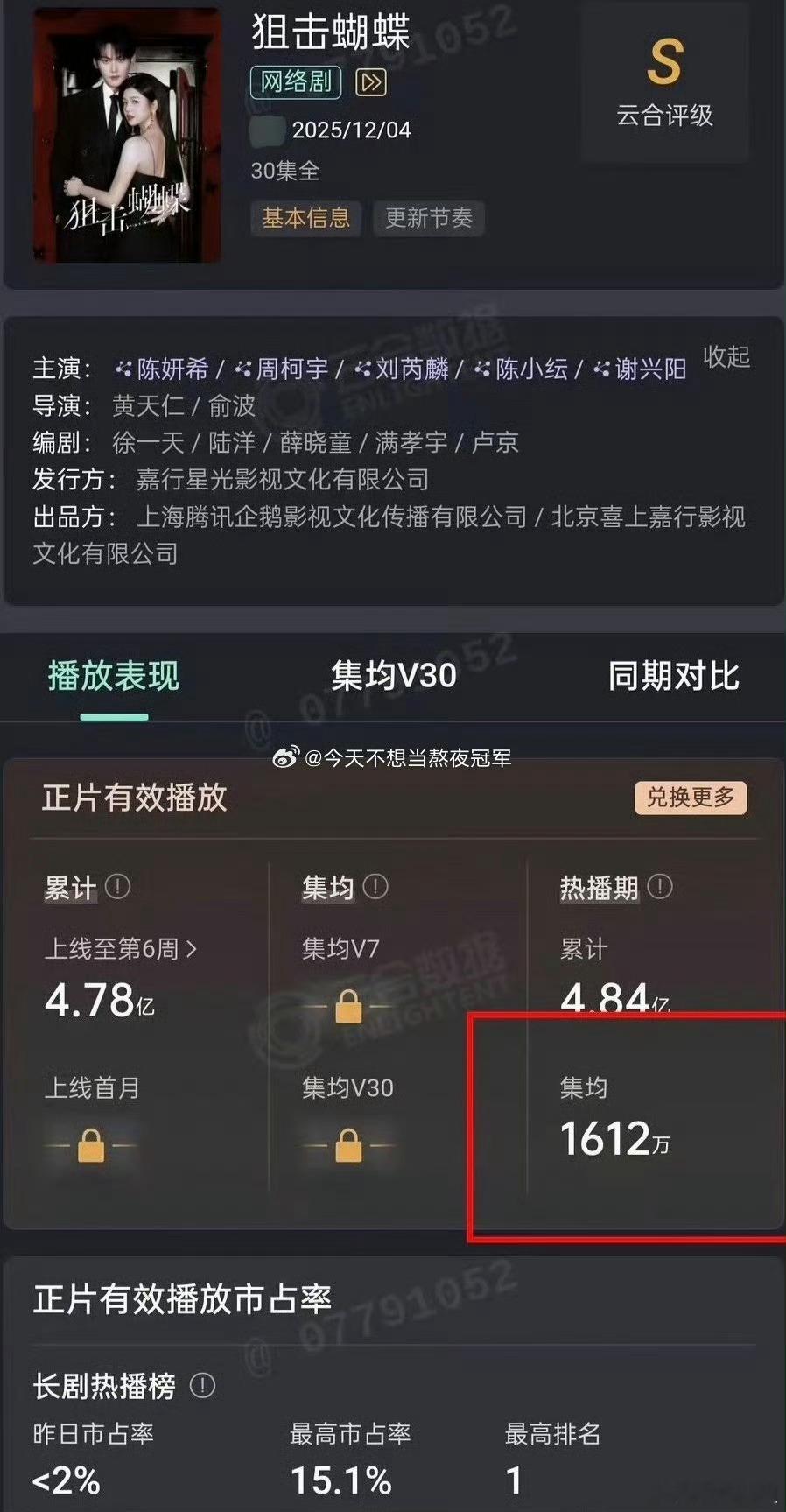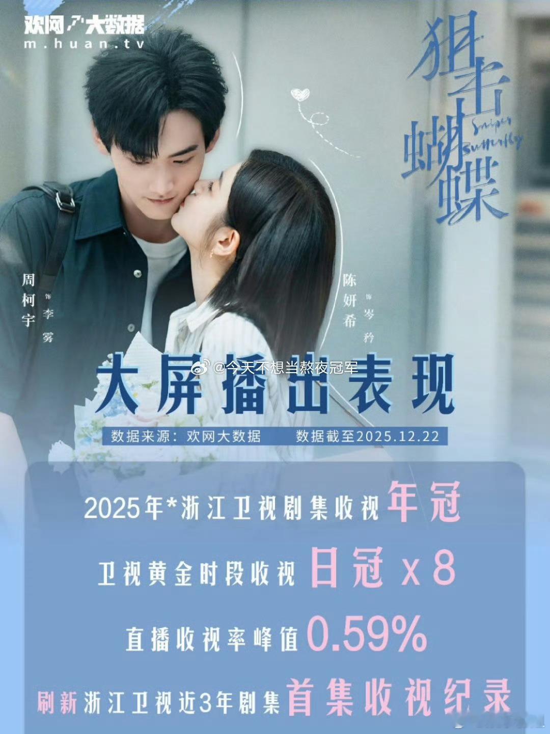 狙击蝴蝶集均1612万陈妍希周柯宇《狙击蝴蝶》最终集均1612万作为2025年末中小成本制作的都市情感剧,以黑马姿态刷新了多项行业记录👍🏻2025微博之夜爆款创作大赛