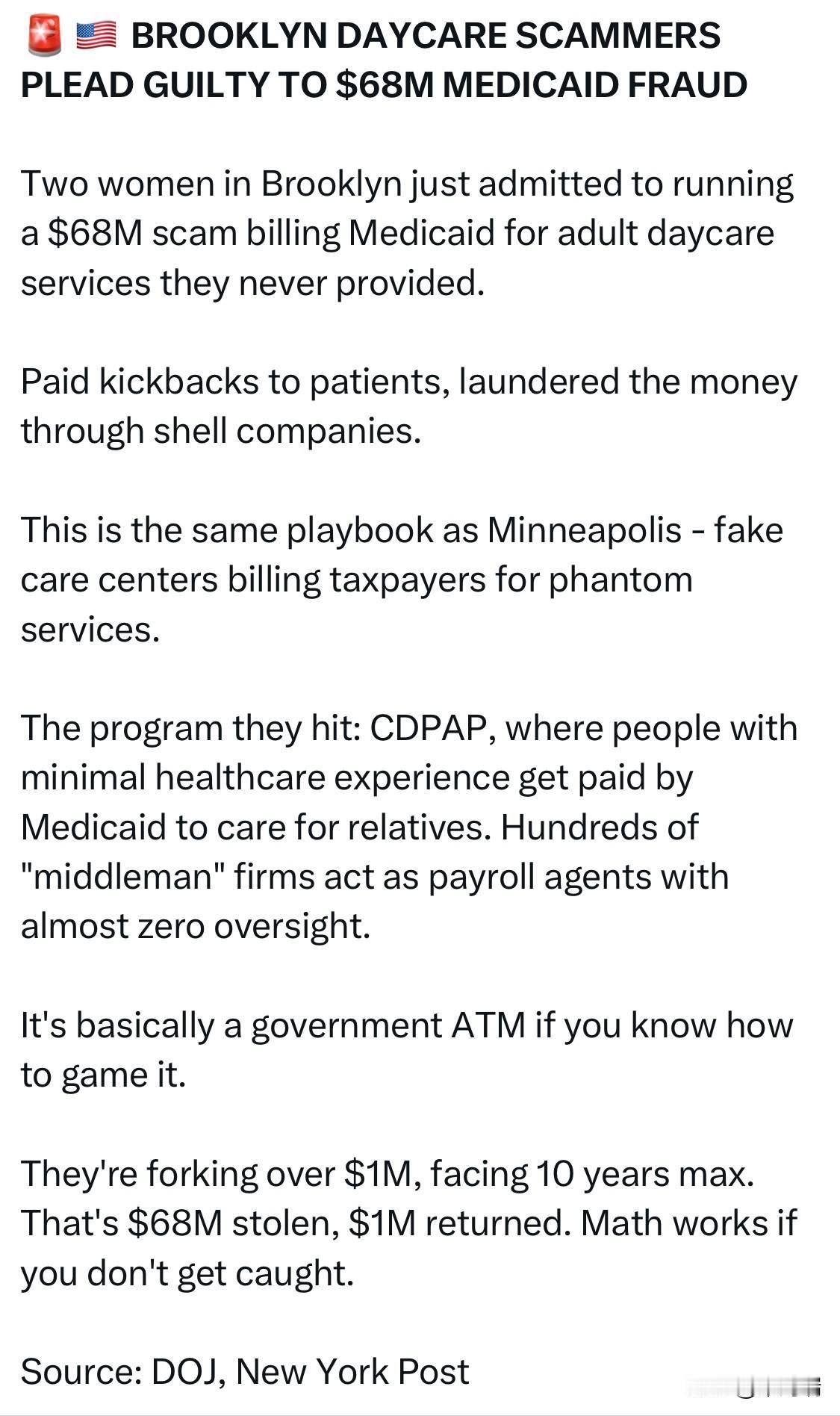 据美国司法部和《纽约时报》提供的信息,纽约市布鲁克林一家家庭社交成人日托(Family Social Adult Day Care)的涉案诈骗犯承认犯有6800万美元医疗补助欺诈罪。 布鲁克林两名女子承认实施了一起涉案金额高达 6800 万美元的诈骗案,她们向医疗补助计划 (Medicaid) 骗取了从未提供的成人日托服务费用。 向病人支付回扣,并通过空壳公司洗钱。 这和明尼阿波利斯的伎俩如出一辙——虚假的医疗中心向纳税人收取虚假服务的费用。 他们打击的项目是CDPAP,该项目允许几乎没有医疗保健经验的人通过医疗补助计划(Medicaid)获得报酬来照顾亲属。数百家“中间商”公司充当工资代理机构,几乎没有任何监管。 如果你知道如何利用它,它基本上就是一台来自政府的自动取款机。 他们交出100万美元的赔偿金,最高刑期10年。也就是说,被盗的6800万美元,只追回了100万美元。只要不被抓,这笔账算得通。