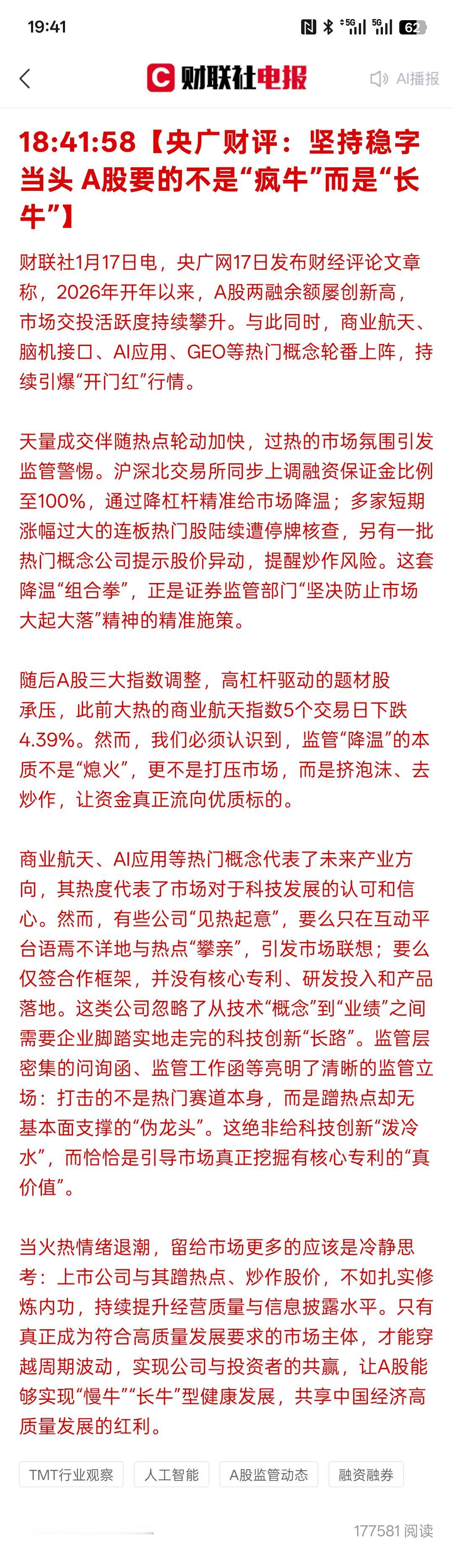 坚持稳字当头 A股要的不是“疯牛”而是“长牛”,中国股市的投资发生了转变,上市公司应该苦练内功才是企业长远发展的前景,而不是只为了炒作股价去蹭热点蹭概念,其本身没有核心技术的竞争,你的上市公司就好比伪劣产品,作为科技公司就应该拥有自己的核心技术,而不是整天想着去蹭别人的热点! 所以,关于目前中国资本市场未来的发展前景非常明确,要的就是投资有核心竞争力的企业,有业绩支撑的企业,有基本面支撑的企业,有发展逻辑支撑的企业!这关系到未来中国高质量发展,尤其是科技创新的发展!是纯粹的蹭热点概念炒作。你要的是上市公司踏踏实实的发展创新,让企业做强做大,回馈社会,回馈投资者,而不是整天想那歪门邪道,推动股价减持套现,让自己暴富。上市公司应该注重企业内部发展,企业创新能力,企业新技术!这才是上市公司上市应该做的本质问题!如果上市都是为了炒作,那上市的意义价值又何在? 随后A股三大指数调整,高杠杆驱动的题材股承压,此前大热的商业航天指数5个交易日下跌4.39%。然而,我们必须认识到,监管“降温”的本质不是“熄火”,更不是打压市场,而是挤泡沫、去炒作,让资金真正流向优质标的。 最近这段时间的商业航天AI概念应用一顿狂涨,有些企业并没有核心技术,但是非要去蹭热点,或者只是签署了什么意向合同,就拿出来发布类似的消息,让不明真相的投资者也去跟风!就在后台互动平台与投资者去讨论,其实就是攀亲攀那些拥有核心企业发展龙头上市公司的光环,然而,有些公司“见热起意”,要么只在互动平台语焉不详地与热点“攀亲”,引发市场联想;要么仅签合作框架,并没有核心专利、研发投入和产品落地。这类公司忽略了从技术“概念”到“业绩”之间需要企业脚踏实地走完的科技创新“长路”。监管层密集的问询函、监管工作函等亮明了清晰的监管立场:打击的不是热门赛道本身,而是蹭热点却无基本面支撑的“伪龙头”。这绝非给科技创新“泼冷水”,而恰恰是引导市场真正挖掘有核心专利的“真价值”。 当前的资本市场投资方向发生了根本性的变化,要的就是价值投资,投资企业必须是有核心竞争力,有核心技术,有业绩支撑的企业,而不是纯概念炒作的企业!所以,未来的中国资本市场将是一个筛选上市公司的资本市场,也是投资者真正用真金白银去投优质公司的资本市场!未来的中国股市投资理念将发生根本性的改变,中国资本市场正在发生变化,变得越来越规范化! 当火热情绪退潮,留给市场更多的应该是冷静思考:上市公司与其蹭热点、炒作股价,不如扎实修炼内功,持续提升经营质量与信息披露水平。只有真正成为符合高质量发展要求的市场主体,才能穿越周期波动,实现公司与投资者的共赢,让A股能够实现“慢牛”“长牛”型健康发展,共享中国经济高质量发展的红利。