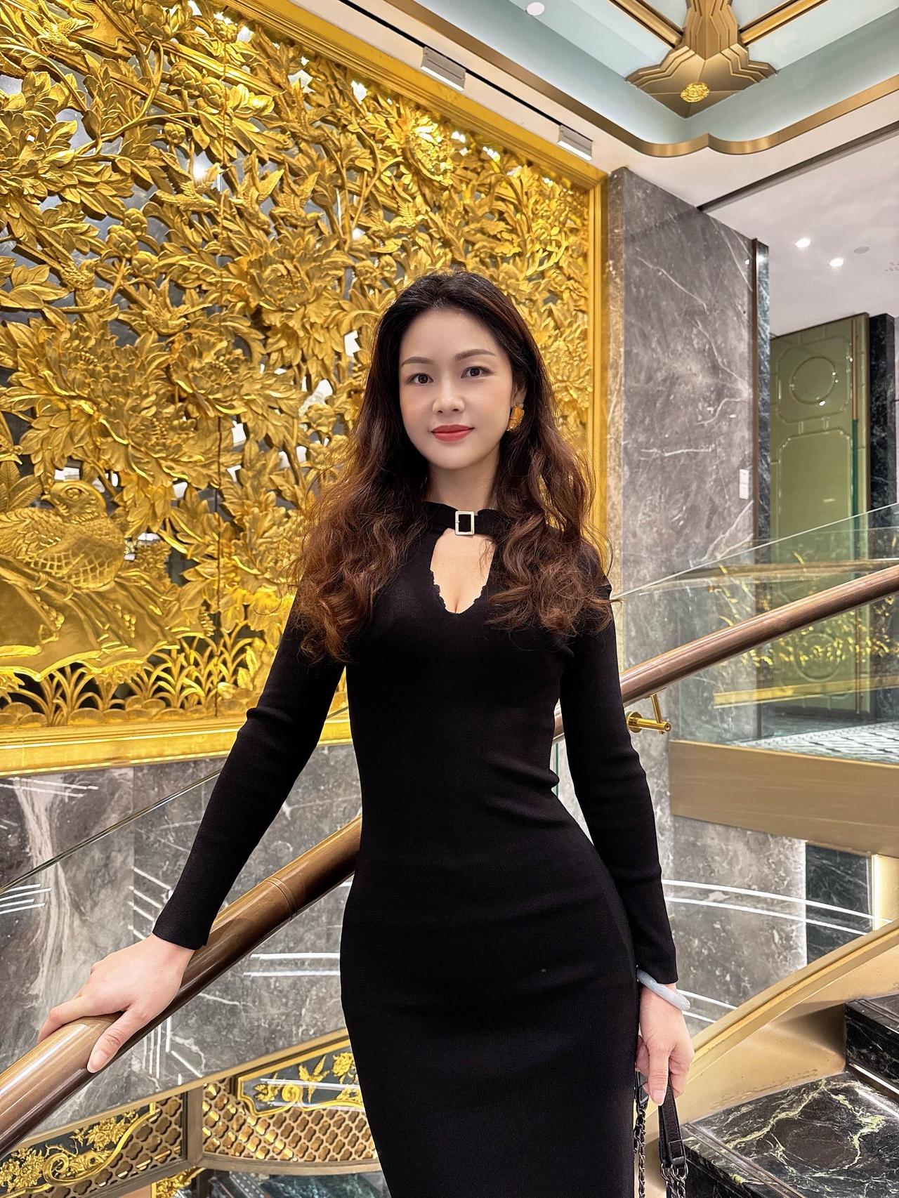优雅黑裙,金色背景,自信微笑,时尚穿搭
