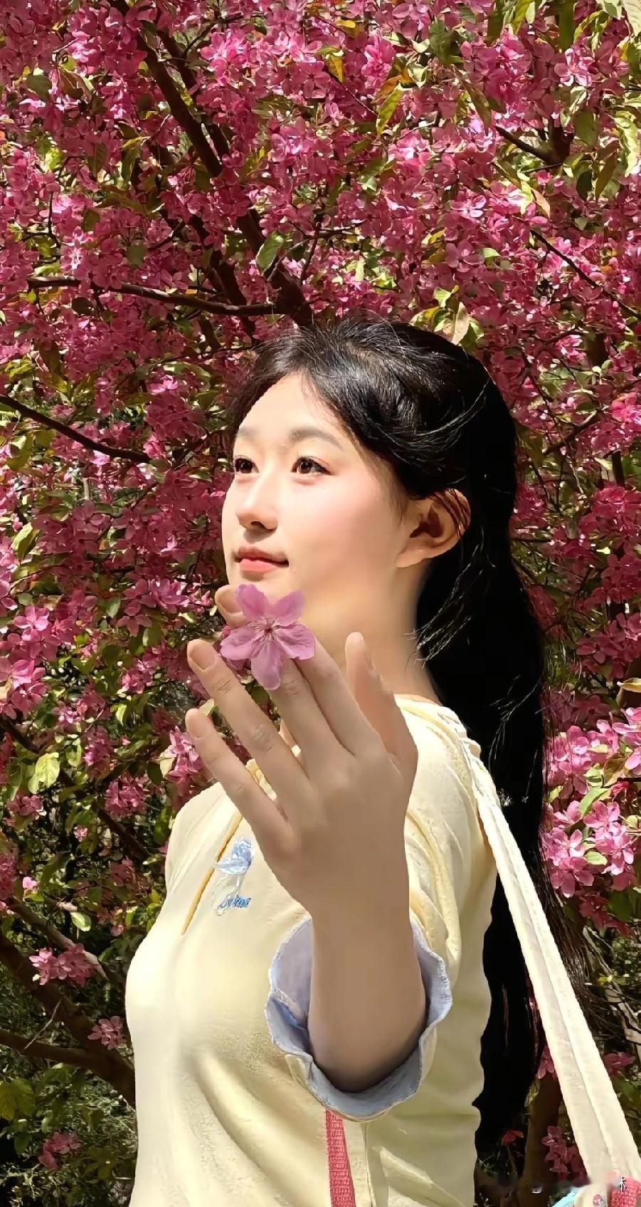 樱花树下,少女轻抚花枝,春意盎然。
