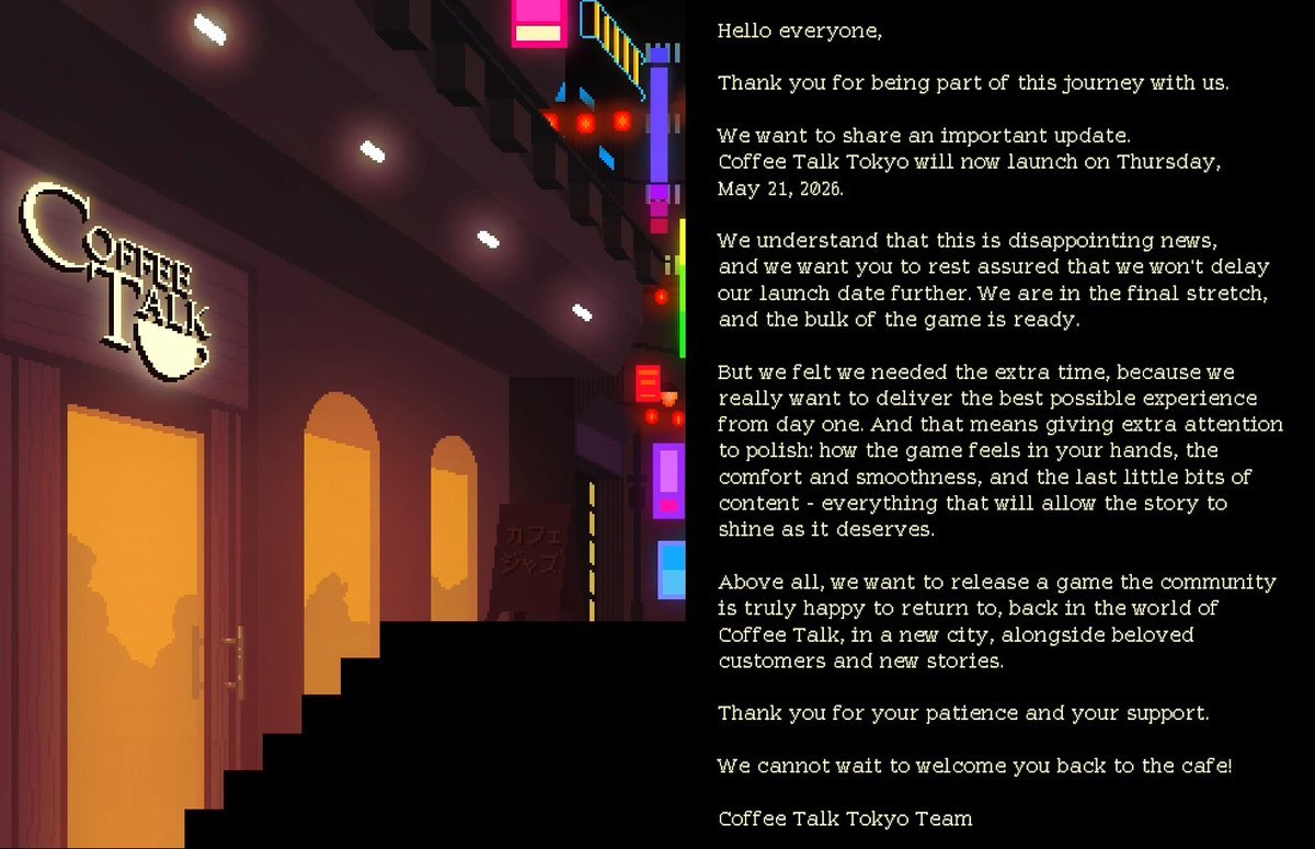 【《咖啡心语》系列新作宣布延期发售】官方宣布《咖啡心语》系列最新作《东京咖啡畅谈》从原定的3月5日延期至5月21日发售,适用于Steam、PS5、Xbox和Switch平台。开发团队表示此次延期是为了提供最佳的游戏体验,需要一点时间来进行最后打磨工作,并保证将不会再度跳票。《东京咖啡畅谈》故事发生在东京的一家深夜咖啡馆,玩家将扮演咖啡师,为顾客调制暖心饮品。每一杯咖啡都会改变对话氛围,并揭开独特的角色故事与内心挣扎。以下是开发团队的延期声明:“《东京咖啡畅谈》的发售日期已调整至2026年5月21日(周四)。我们完全理解这一消息可能会让大家失望。但是请放心,发售日不会再推迟了:游戏开发已进入尾声阶段,大部分内容也已完成。然而,我们决定需要更多的时间来确保游戏在一开始便能提供最佳体验。希望能专注于打磨游戏,提升玩家操作的手感、舒适度和流畅度,并对细节进行微调,使得故事能够完美呈现。最重要的是,我们希望打造出一款让玩家真正乐于回归的游戏,也希望大家能重返《咖啡心语》的世界。在新城市中与熟悉的老顾客重逢,开启一段全新故事。衷心感谢大家的理解与支持。我们期待着您再次光临咖啡馆的一天。”咖啡心语