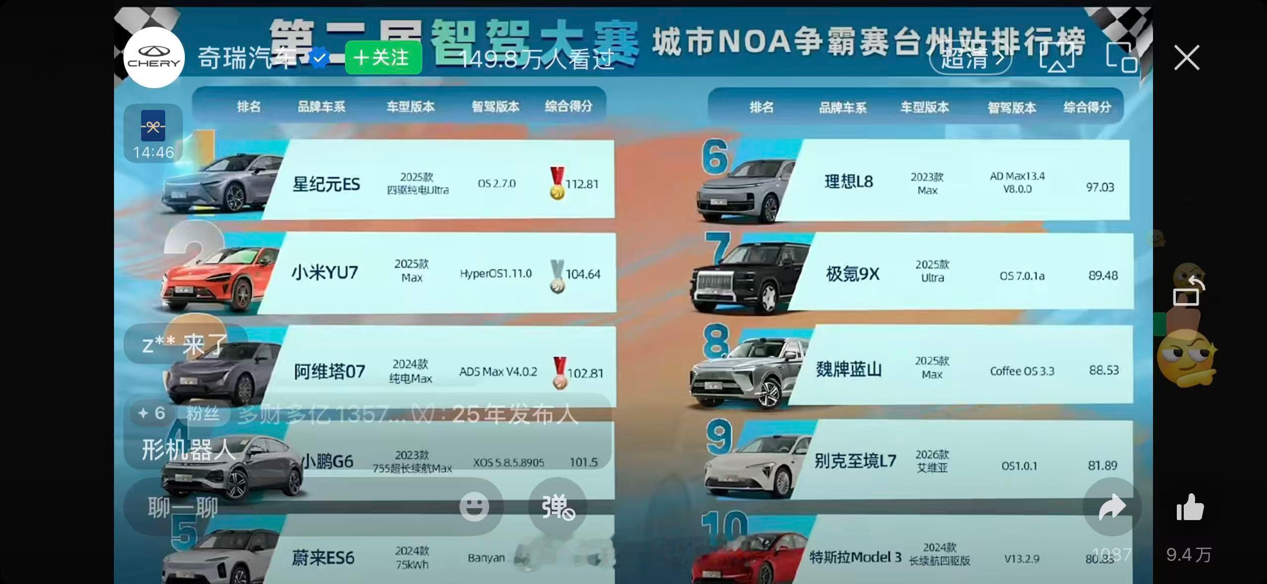2026奇瑞汽车AI之夜上,我们的第二届中国智驾大赛 台州站的成绩又被官方认可了!已经记不清是第几次上直播了,我们的大赛被更多的车企和方案商关注,也是对我们的一种鼓励,同样车主们在大赛上对各家的期待和建议也都会被关注,而每一站比赛过程中所出现的需要优化的点也能更好的帮助他们快速的提升,后面的每一站都要更加认真的对待,期待更多的车主们参加!