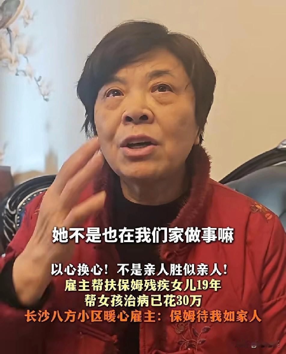 以心换心! 在长沙八方小区 一位暖心雇主用19年的行动诠释了“以心换心” 她不仅把保姆当家人看待,更在得知保姆女儿身患残疾后 主动承担起治疗费用,至今已花30万元,只为让孩子能得到更好的救治 雇主说:“她待我如家人,我自然也会把她的事当成自己的事。” 而保姆也用无微不至的照顾回报这份信任 甚至主动帮雇主洗脚,这份双向奔赴的温暖,看哭了 19年的帮扶不是亲人胜似亲人!如果是你遇到这种情况 会做出和这位雇主一样的选择吗? 7