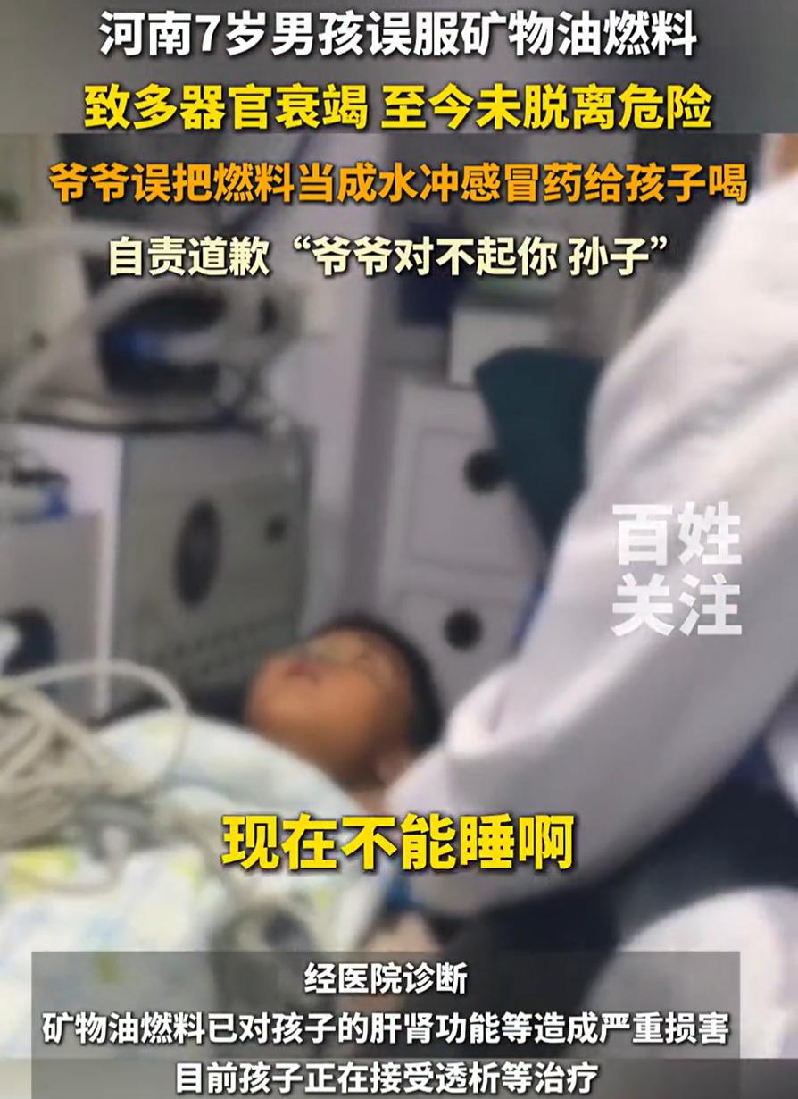 “天都塌了!”河南郑州,一名7岁男孩感冒生病,爷爷就用矿泉水瓶里的水给孩子冲药喝,可孩子喝了一口就发现不对劲,随后更是呕吐不止,神志不清,爷爷打电话问孩子爸爸,才知道里面根本不是矿泉水,而是矿物油燃料 当天,爷爷照顾7岁孙子时发现孩子感冒了。他随手拿起一瓶看起来像矿泉水的瓶子,兑了点温水,准备给孩子冲感冒药。孩子喝了一口就告诉爷爷味道不对劲,但当时爷爷没太在意 不久后孩子开始呕吐,精神也变得恍惚。爷爷这才意识到问题严重,赶紧打电话问儿子那瓶水到底是什么。电话那头的父亲一听就慌了,那不是矿泉水,而是他专门从火锅店朋友那里要来的火锅燃料,一种矿物油燃料 孩子被紧急送往医院,情况迅速恶化。不到一个小时,他开始呕吐、昏迷,随后被诊断为急性肝衰竭和肾衰竭,直接被送进重症监护室。医生全力抢救,但孩子至今仍未脱离危险 面对这一切,孩子的父亲在病房外痛哭流涕。他说,如果孩子真的救不回来,他不知道今后的日子该怎么过。而爷爷更是陷入了深深的自责,不断向家人道歉,说是自己害了孙子 有网友指责爷爷,也有网友指责父亲,但说实话,他们两人可能比谁都难受,父亲当初要这瓶燃料,本是为了和家人围坐一起吃顿热腾腾的火锅,谁能想到它会被误当成矿泉水放在桌上。爷爷随手一拿,也只是想尽快给孙子缓解感冒症状 生活中这样的疏忽并不少见。我们家里可能都有类似的容器——用饮料瓶装清洁剂、用矿泉水瓶装其他液体。很多时候我们觉得自己记得住,不会弄混,但在紧急或匆忙的情况下,人的判断很容易出错 这件事提醒我们,家里的危险物品一定要妥善存放。特别是液体燃料、清洁剂等有毒有害物质,绝对不能使用食品饮料的原始包装来分装。如果必须分装,一定要贴上醒目的标签,写明内容物和危险警示,并放在孩子绝对拿不到的地方