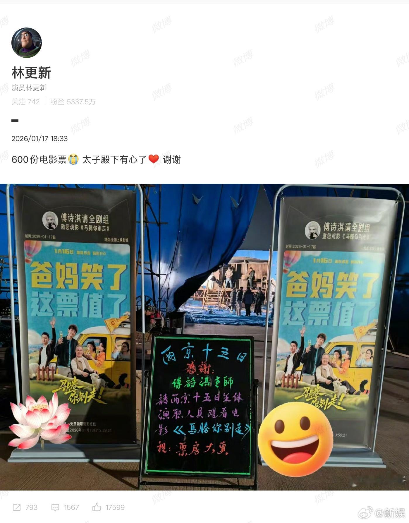 成毅给林更新电影包场600份成毅给林更新新电影《马腾你别走》包场600份,也是给剧组同事的排面拉满了!《两京十五日》拍摄顺利~期待两位未来有更多合作!新娱