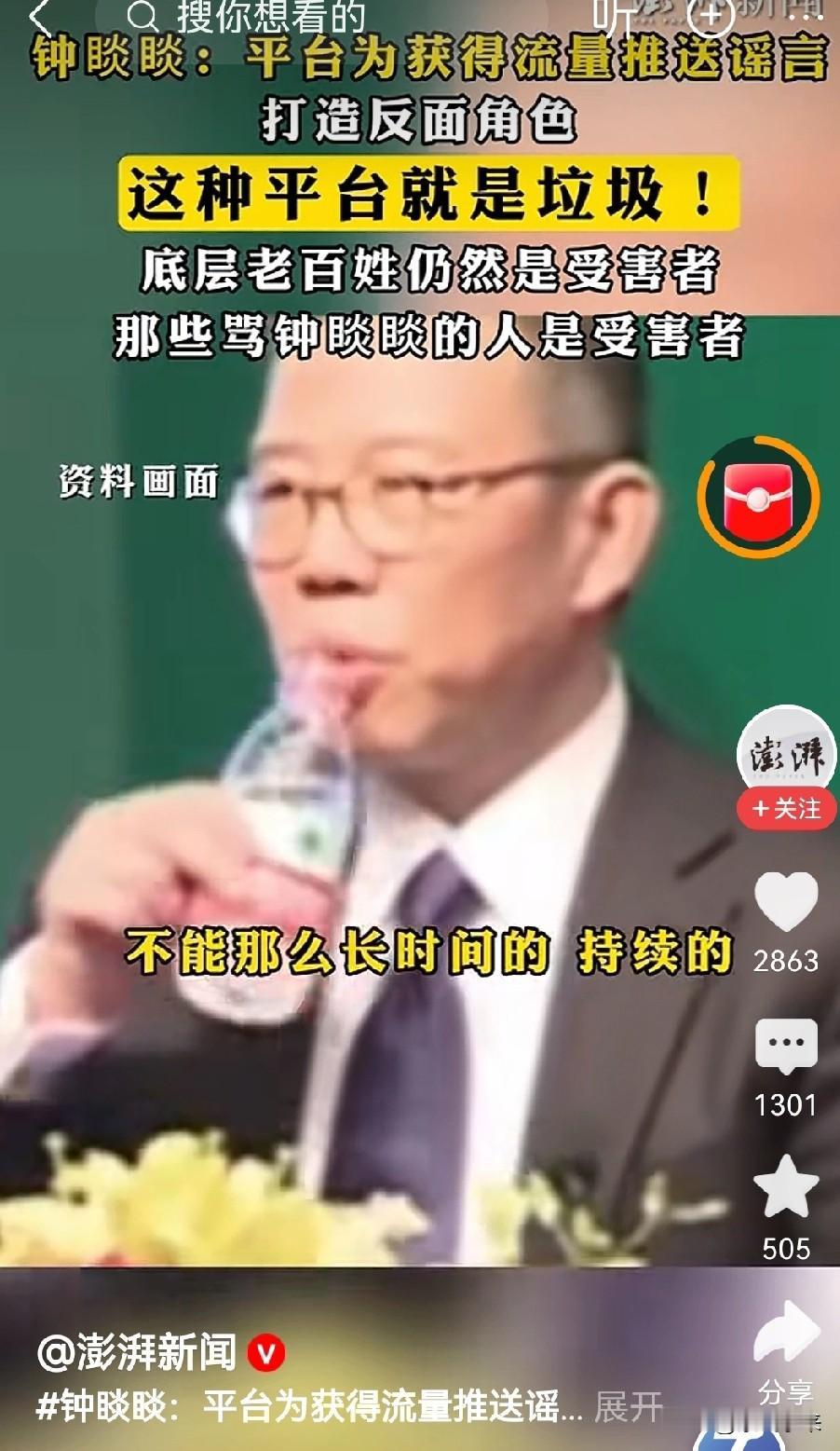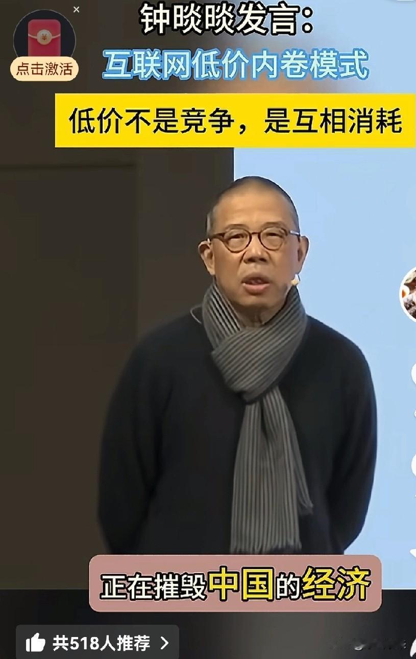 前中国首富钟睒睒说的话让人折服,振聋发聩,太敢说了! 钟睒睒:互联网低价内卷模式正在摧毁中国的经济,低价不是竞争,是相互消耗,商家没有价格支撑,商品的质量肯定上不去!一味追求价格,势必损害商品质量,最终损害老百姓! 说的太对了! 钟睒睒:平台为了流量推送谣言,打造反面角色,这种平台就是垃圾平台,最终受害的还是老百姓!那些骂我的人也是受害者! 这段话的内涵很丰富,细思极恐! 我最欣赏的钟睒睒的一句话:社会的恶是上层知识分子产生的。说的太对了,老百姓认知有限,知识面有限,老百姓是最善良最淳朴的!钟睒睒