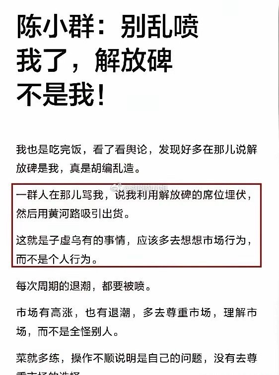 陈小群正面硬刚:解放碑不是我!别乱喷了刚看到游资大佬陈小群的最新回应,直接把锅甩回给了市场:“一群人骂我,说我利用解放碑席位埋伏,再用黄河路吸引出货,这完全是子虚乌有!”大佬的核心观点很扎心但是也很客观事实:✅ 多思考市场行为,少纠结个人恩怨✅ 周期退潮是常态,别每次都找“背锅侠”✅ 菜就多练,操作不顺,本质是自己没尊重市场的选择其实A股老股民都懂,每次行情退潮时,市场总需要一个“情绪出口”,把下跌的锅甩给某个席位或游资。但真相是,涨涨跌跌都是市场合力的结果,与其互相指责,不如反思自己的交易节奏。对于资深交易者而言,更应关注的是席位背后的资金流向、板块轮动节奏以及市场情绪周期变化,而非纠结于“某席位是谁的”。毕竟,A股从来不是单一资金能主导的市场,个体操作终究要服从于整体趋势。难道每次退潮都需要一个“背锅侠”来宣泄情绪吗?不过小群有一点做的不地道的是,涨停封单常挂大量9898的封单,有引导投资者引导情绪的嫌疑,记得之前有其他席位用9898的封单还被小群喷,这些网上都是有记录的~所以说小群也不是那么的无辜!