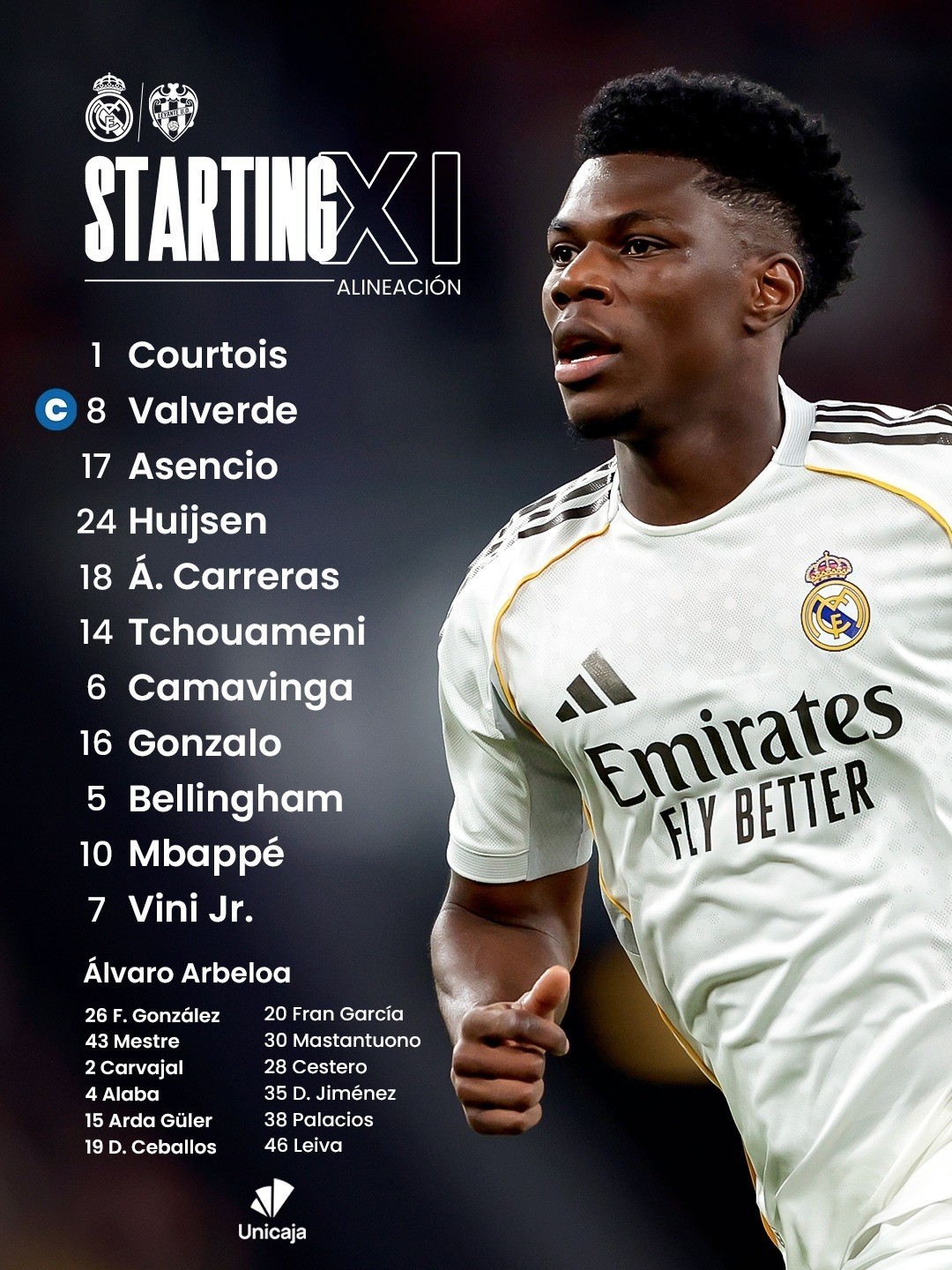 #皇马vs莱万特首发##皇马vs莱万特# 北京时间1月17日21:00,西甲第20轮继续进行,皇家马德里坐镇伯纳乌球场迎战莱万特,本场主裁判为米格尔-塞斯马,赛前双方首发出炉。皇家马德里首发:1-库尔图瓦、8-巴尔韦德、17-劳尔-阿森西奥、24-赫伊森、18-阿尔瓦罗-卡雷拉斯、14-楚阿梅尼、6-卡马文加、5-贝林厄姆、7-维尼修斯、16-贡萨洛-加西亚、10-姆巴佩替补:26-弗兰-冈萨雷斯、43-梅斯特雷、2-卡瓦哈尔、4-阿拉巴、15-居莱尔、19-塞瓦略斯、20-弗兰-加西亚、28-豪尔赫-塞斯特罗、30-马斯坦托诺、35-戴维-希门尼斯、38-塞萨尔-帕拉西奥斯、46-阿尔瓦罗-莱瓦#看西甲上咪咕#