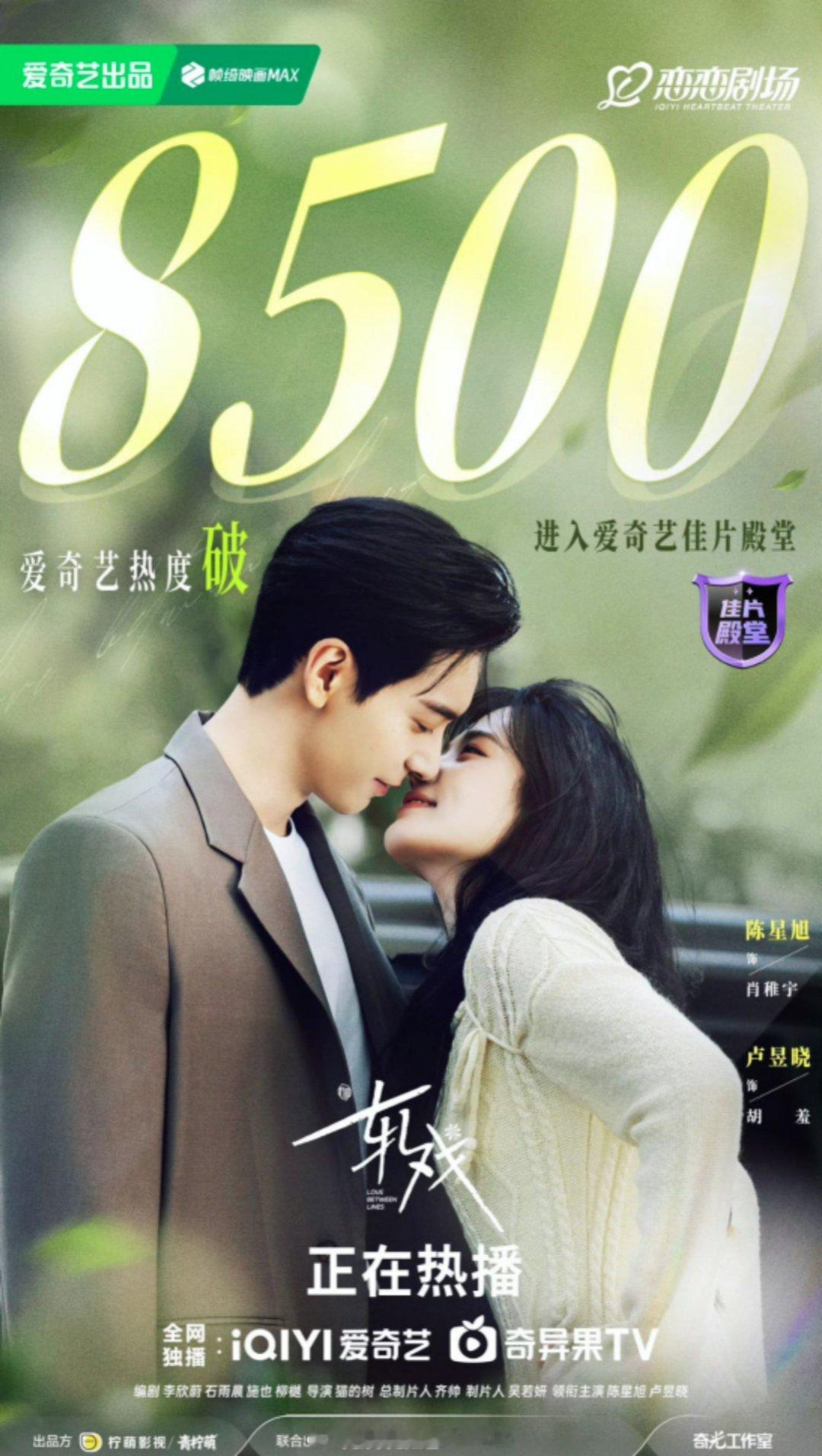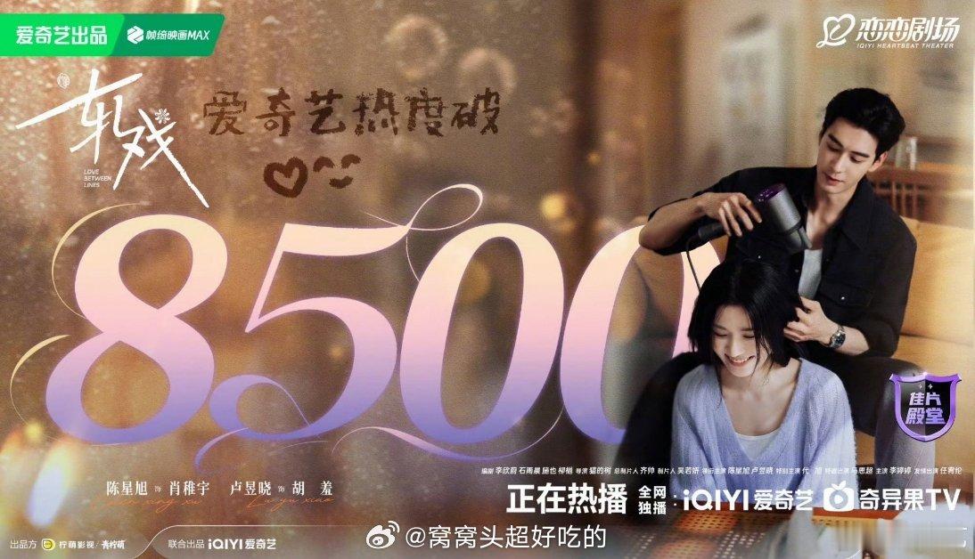 轧戏爱奇艺热度破8500我们轧戏真的打了好漂亮的仗,热度破8500了!云合评级s+ 今天还加了新广男女主在一起了,好多自来水入场,现偶果然还是要陈星旭卢昱晓这种男帅女美的养眼组合,好看好看,每天等更新
