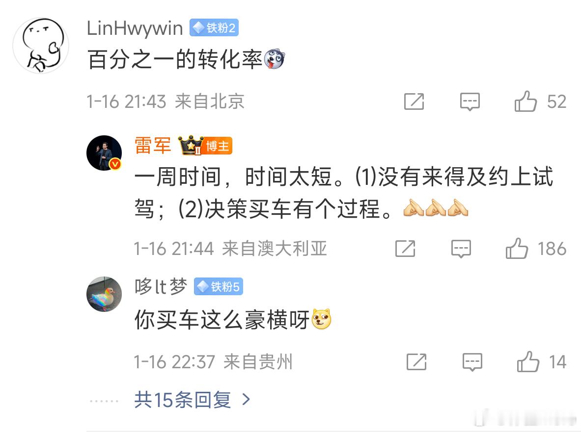 买车是个大事,平销期对单一个人来说,多看几家多试驾几家是很正常的,又不是上市当天抢购那种。还有真想购买且锁单的用户肯定找是小米车主的好友来平分积分啥的,多得几百块不好么,毕竟雷总的积分用户又得不到,从雷总这里锁单的是真爱了,快不快多不多都不具有参考意义。