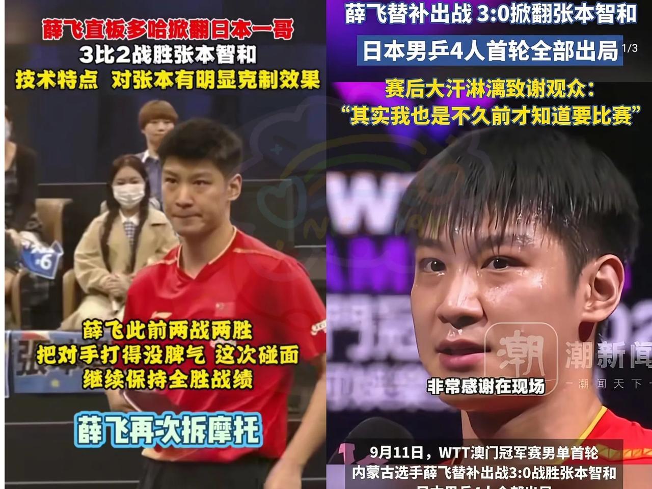 薛飞再次拆摩托成功! 在男子1/8决赛中,薛飞再遇张本智和,薛飞再次证明自己就是张本的克星。一开场,薛飞就气势汹汹,11 : 3轻松拿下首局,开了个漂亮的好头! 之后即便张本扳回两局,可薛飞毫不畏惧,在决胜局依旧果断出手,死死压制住张本,最终3 : 2成功晋级八强!这比分11—3,5—11,11—6,12—14, 11—9,看着就过瘾! 不得不说,薛飞这实力和心态太牛了!张本智和虽然厉害,但碰上薛飞,似乎就有点“水土不服”! 祝贺薛飞! 大家觉得薛飞为啥总能压制张本智和呢?