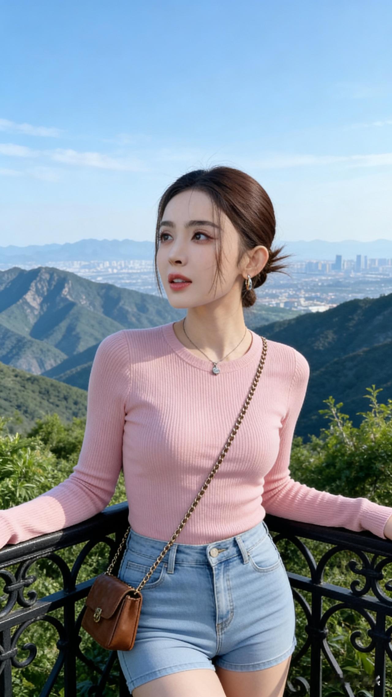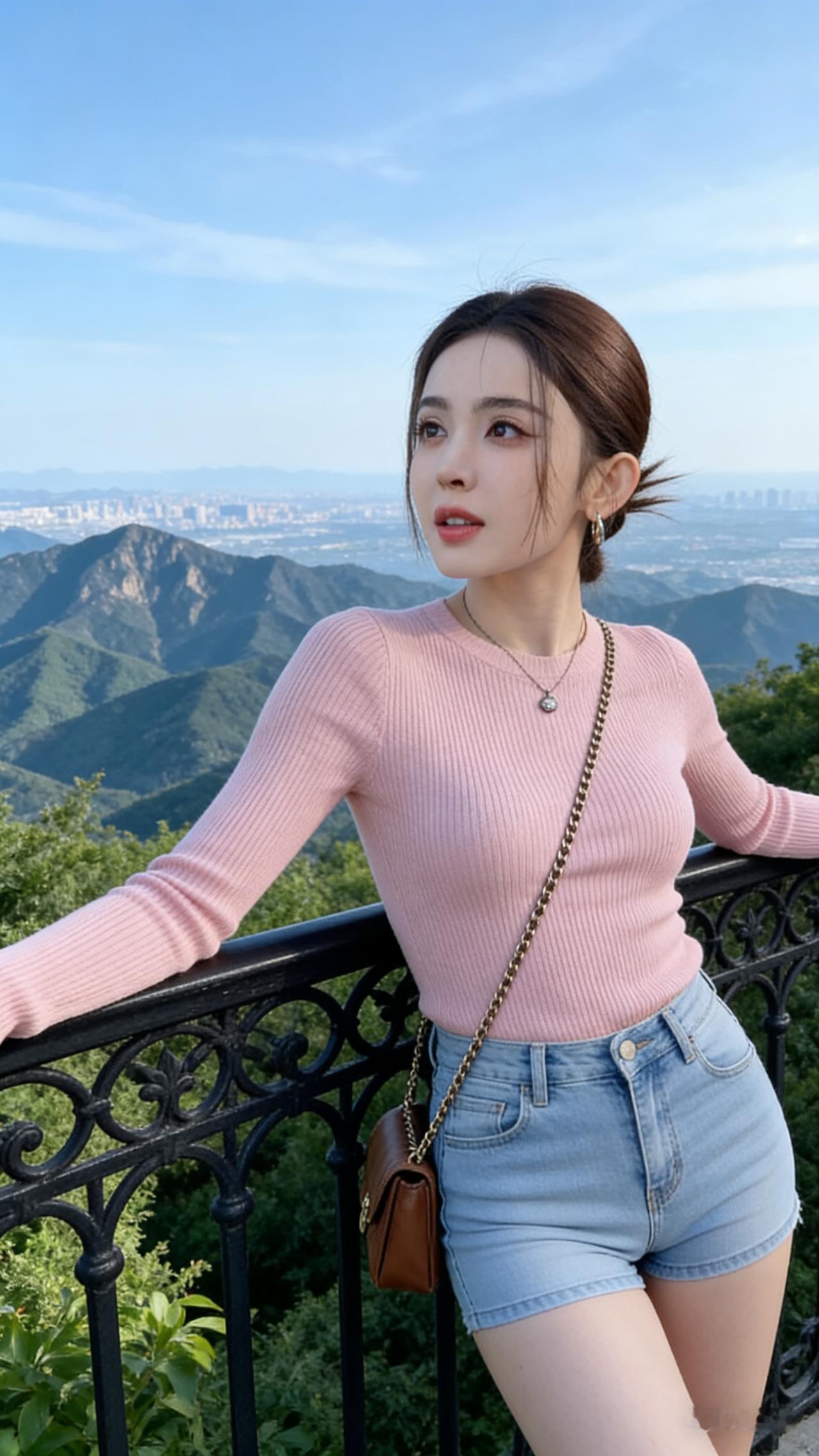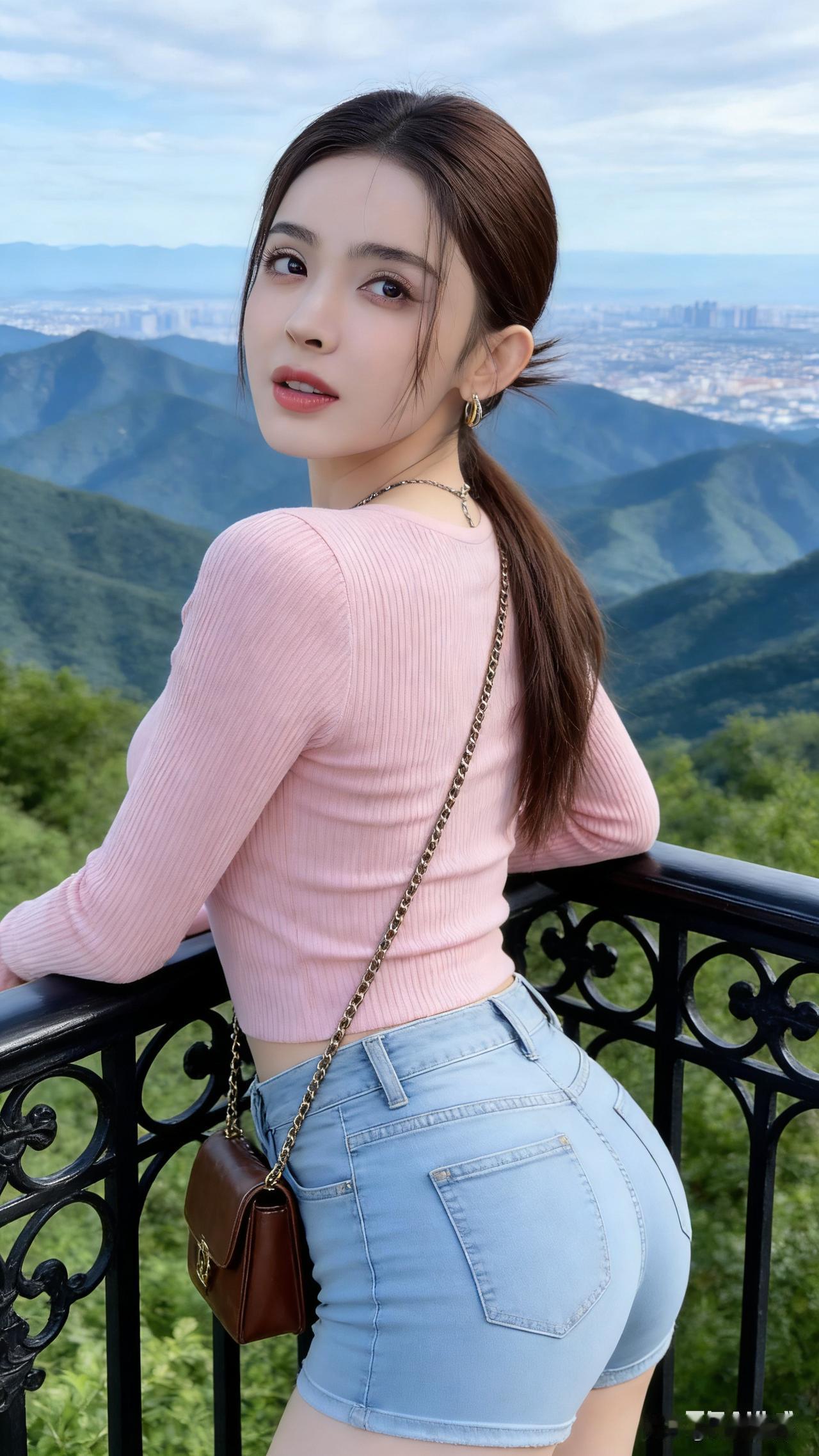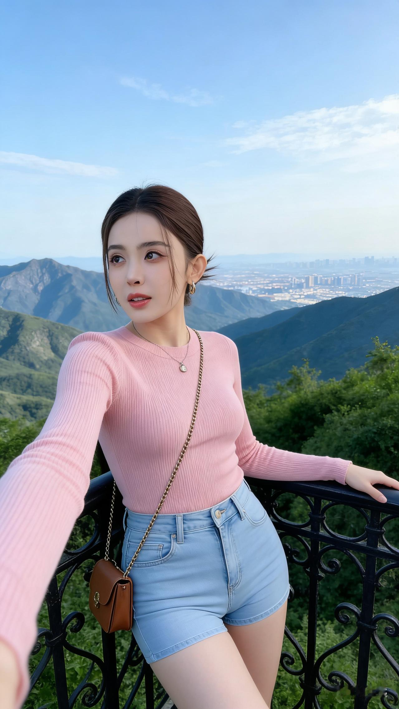 少女心满满的山间自拍,粉色毛衣配牛仔短裤,元气满满!🌿💖