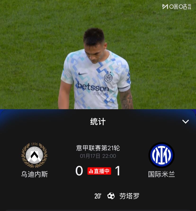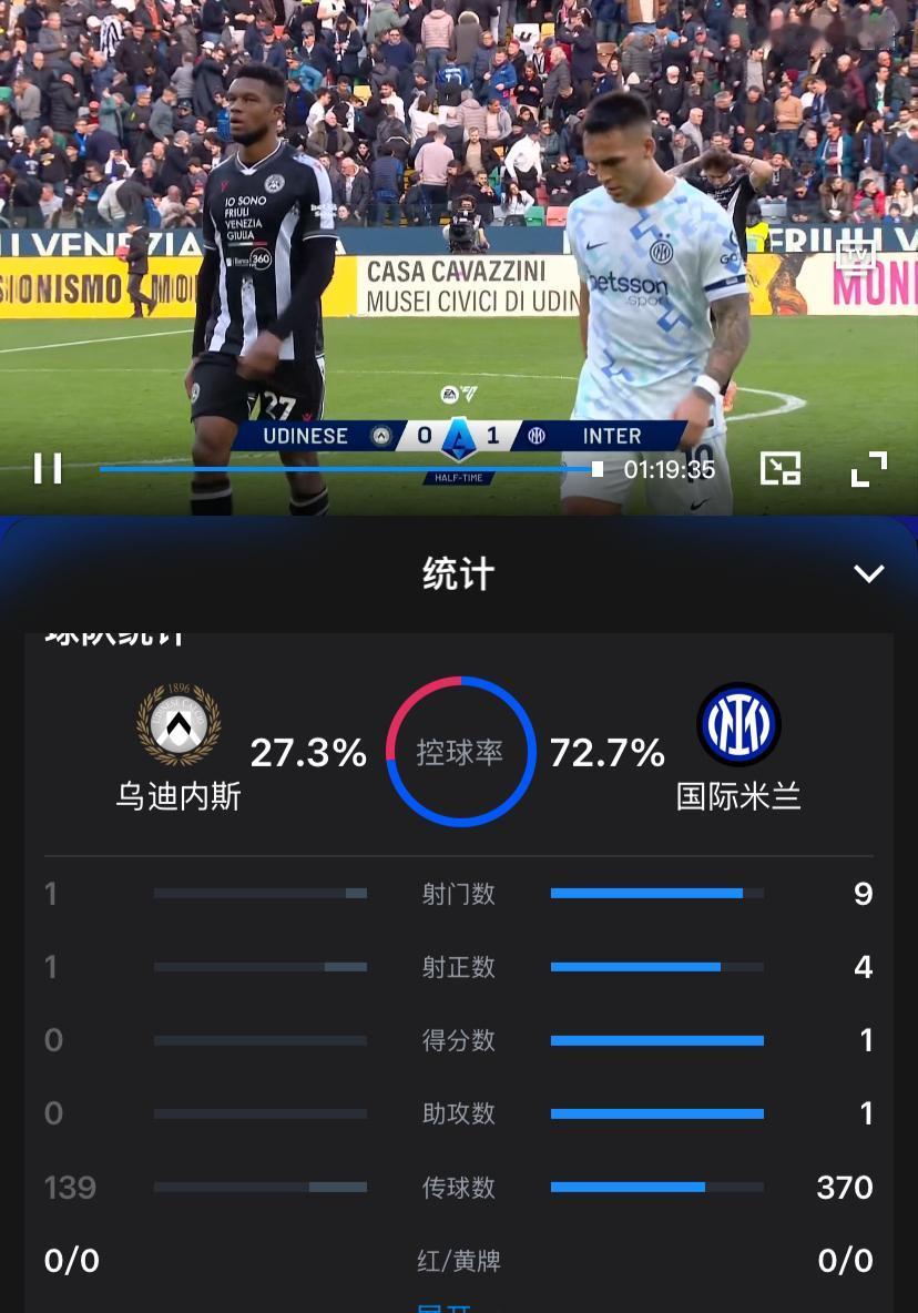 悠着点,保持住!意甲第21轮国际米兰客场挑战乌迪内斯,凭借队长劳塔罗的进球(赛季联赛第11球),上半场国际米兰1:0暂时领先。 为了巩固联赛榜首的位置,本场比赛国际米兰基本全主力出战(巴斯托尼轮休),阿坎吉真的成为生产队的驴了,分毫不休呀。或许是持续一周双赛的缘故以及下周中还有对阵阿森纳的欧冠比赛,国际米兰上半场踢的相对沉稳,拼抢度一般,但优势明显。不过还是得说下巴雷拉,差点因其托大行为造成丢球,巴雷拉本赛季已经多次因托大行为给球队造成危险了,真心希望其能改善自己。 上半场国际米兰优势明显,但仅仅1:0领先,还不保险,期待下半场国际米兰能扩大领先优势,希望以最小的代价保住胜果。