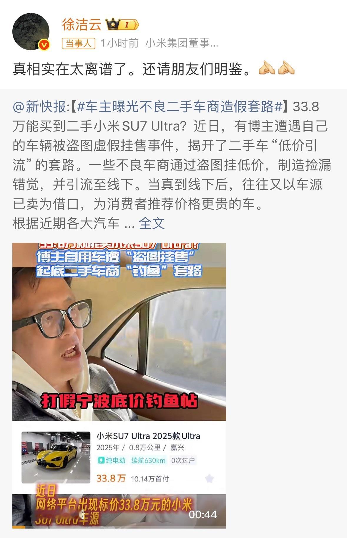 关于小米二手车的问题,其实这事儿已经很明显了,就是二手车商在价格上搞的鬼。一开始先是浮夸的卖惨表演引流关注,给大家制造焦虑问题。在这其中的还有各种盗图挂低价,然后通过线上的点击引流到线下,再给你推销相关的其他产品。这位SU7Ultra车主的经历就是一个典型例子,所以面对二手车商的这种“钓鱼”套路,大家一定切记正规平台、正规手段、正规流程,以此保证自己的切身利益。 徐洁云转发辟谣低价能买二手小米车