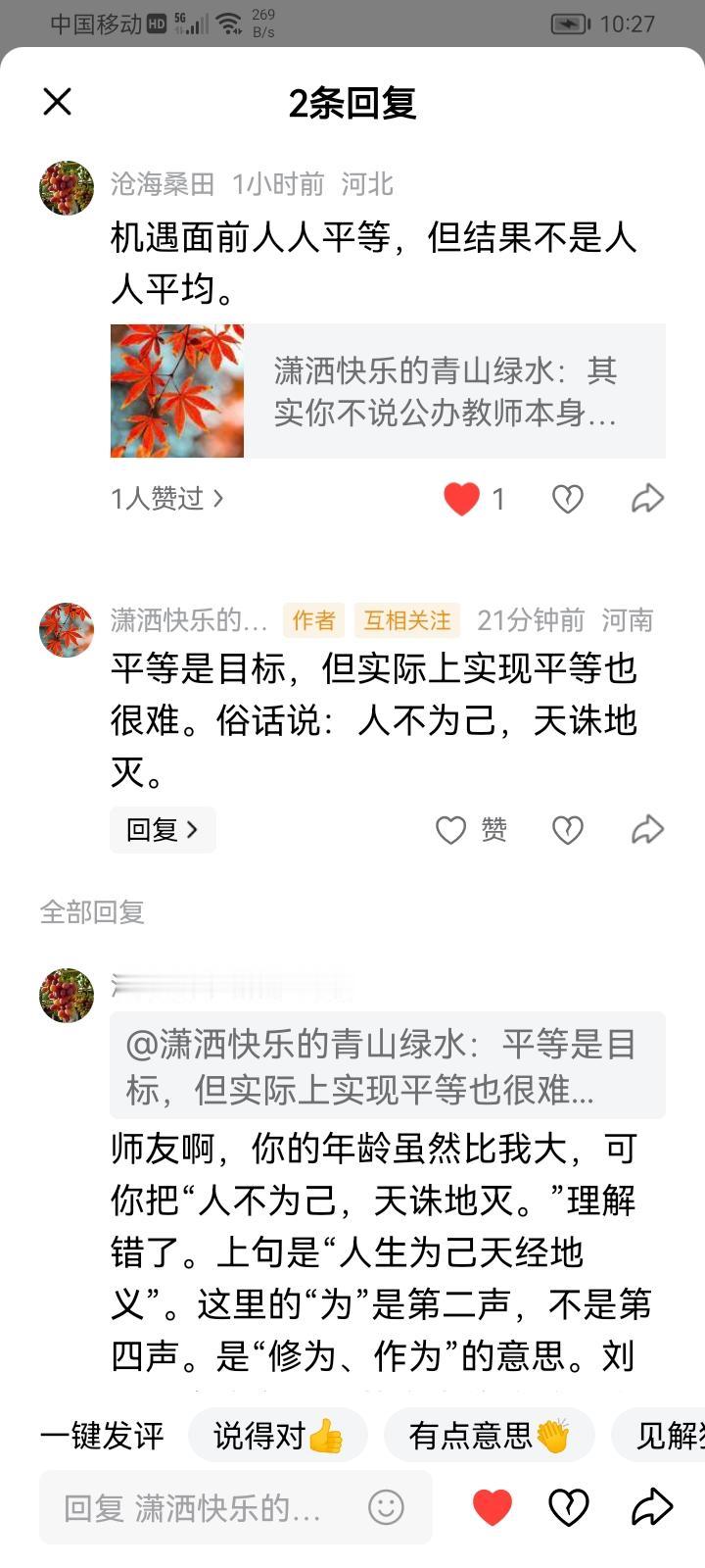 师友啊,你的年龄虽然比我大,可你把“人不为己,天诛地灭。”理解错了。上句是“人生为己天经地义”。这里的“为”是第二声,不是第四声。是“修为、作为”的意思。刘少奇主席在《论共产党的修养》中就应用过这句话。信不信由你!