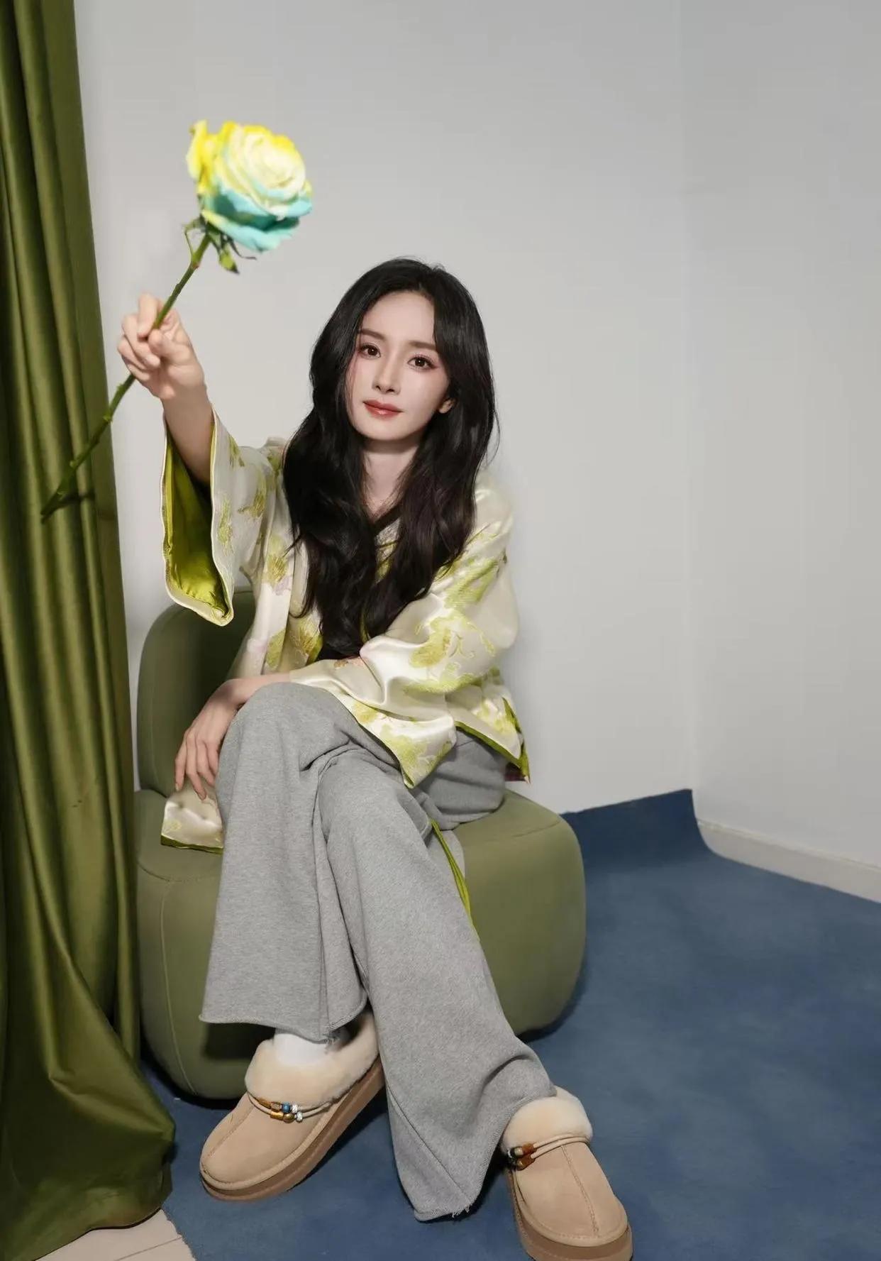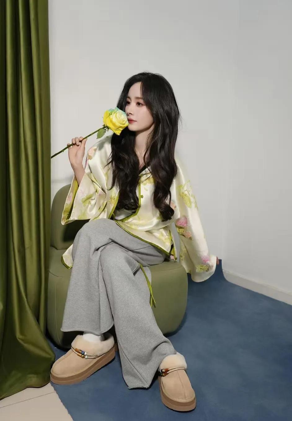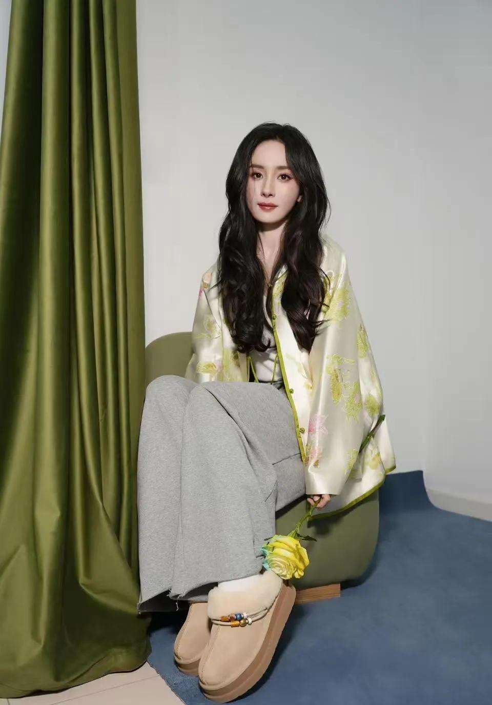 杨幂的新中式穿搭太会了!浅绿提花外套+灰色阔腿裤,松弛高级又显气质,我直接抄作业~杨幂