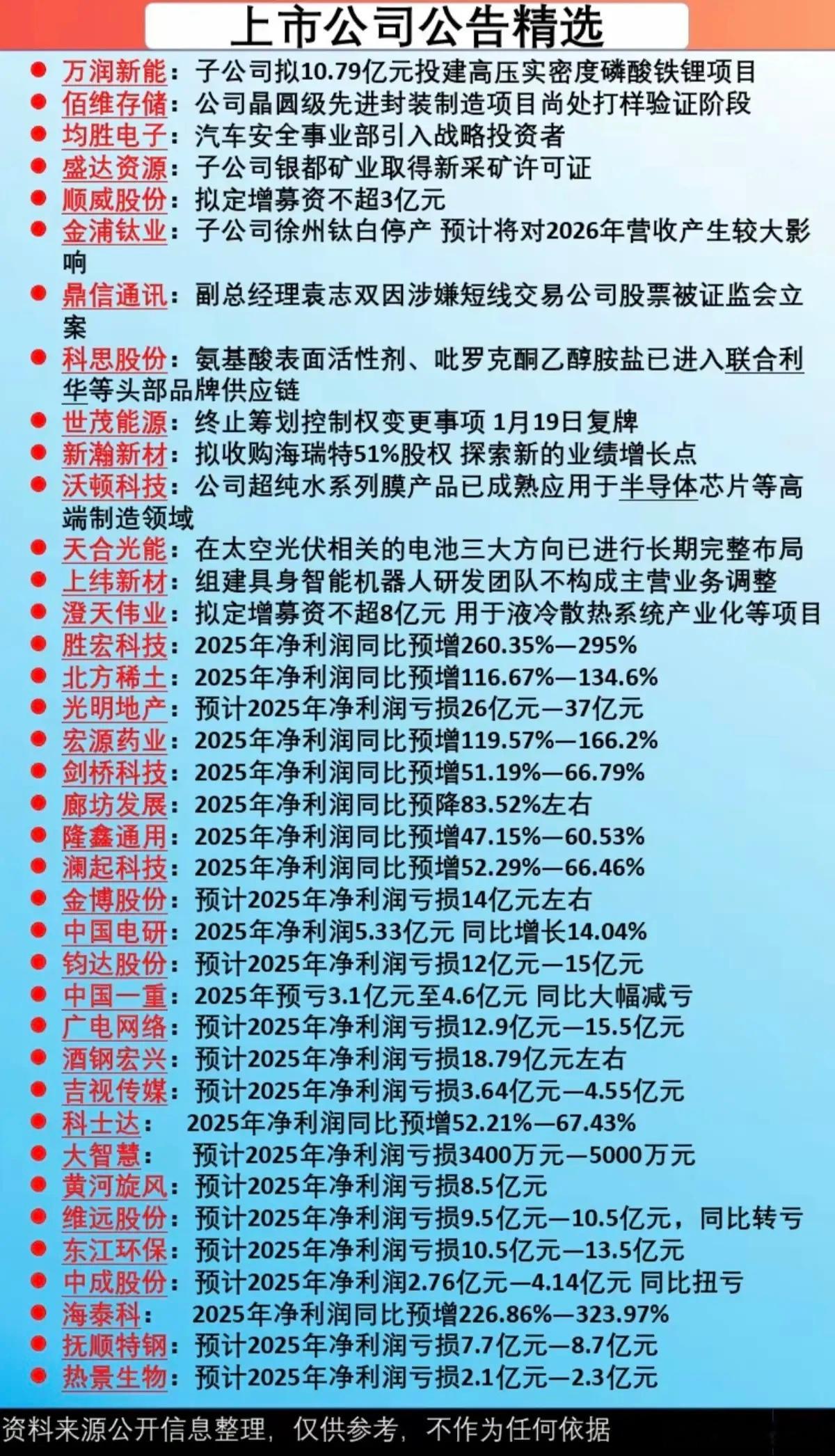 1.17周六 最新:上市公司公告精选!涉及:新建项目,停复牌,定增募资,战略投资,立案调查,多家公司业绩预告