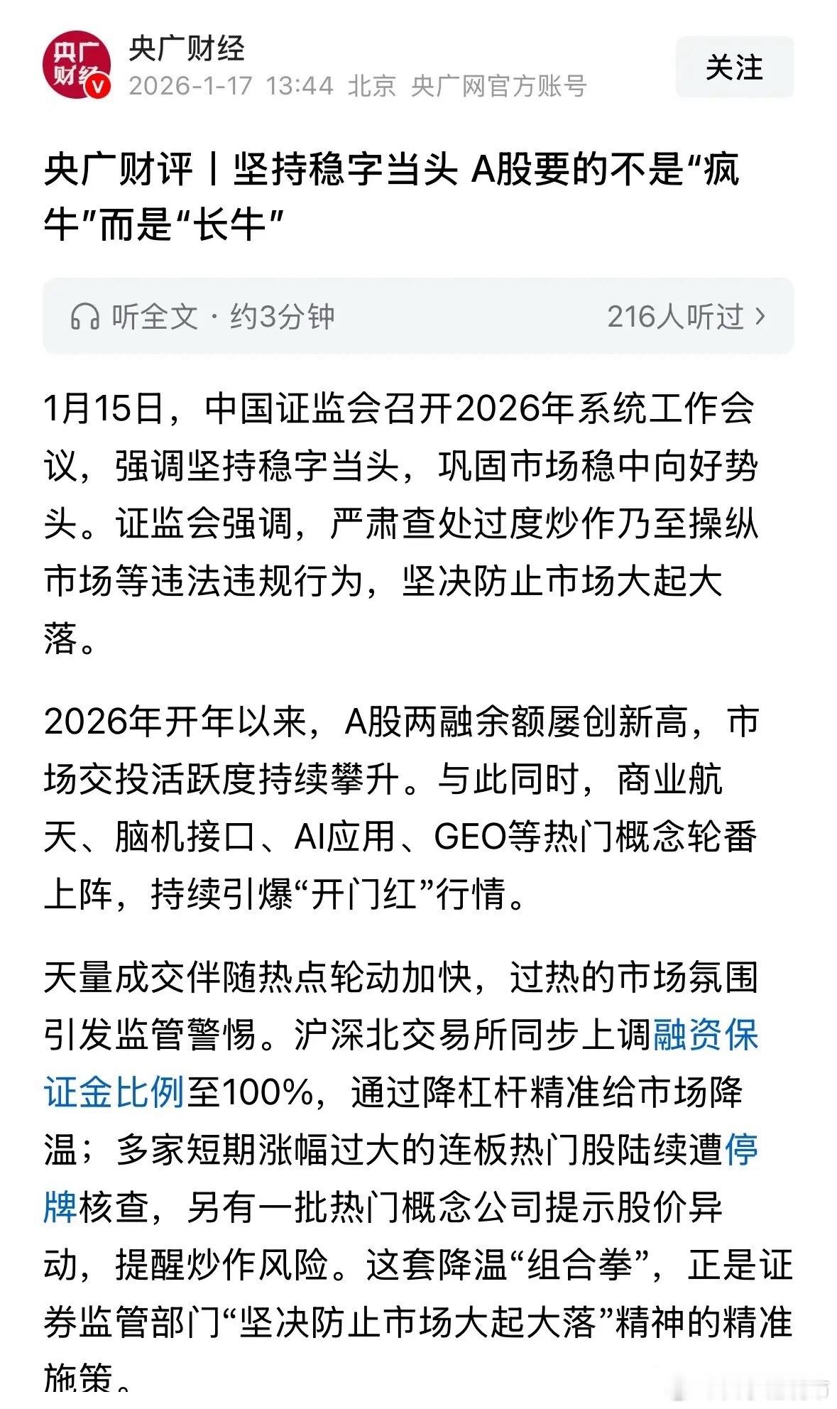 重磅利好消息央视说监管“降温”的本质是要“长牛”,A股下周不会熄火:唱空A股的人可以洗洗睡了!周末重磅利好消息,万众瞩目的A股下周方向到底如何?中央媒体今天发表重要财经评论,监管降温,不是“熄火”,更不是打压市场,而是挤泡沫、去炒作,让资金真正流向优质标的!这样方向就清楚了,停牌,降融资,这些都是防止股市过热的手段,现在的股市越来越像当年的楼市,竟然过热了,这本身就说明A股的慢牛和长牛行情就继续,不翻倍都不好意思说长牛!下周股市大概率继续震荡上涨,不信点赞关注验证高手的预判。