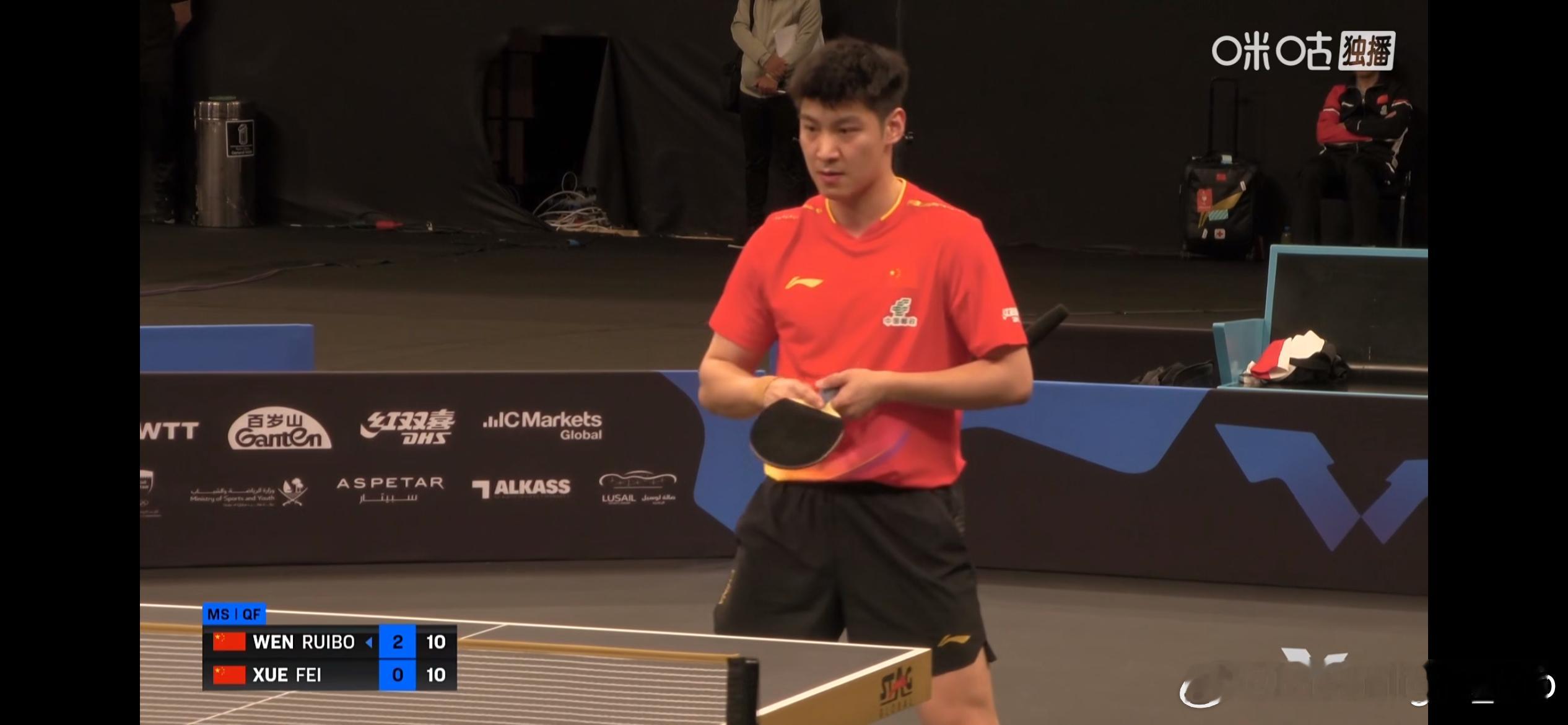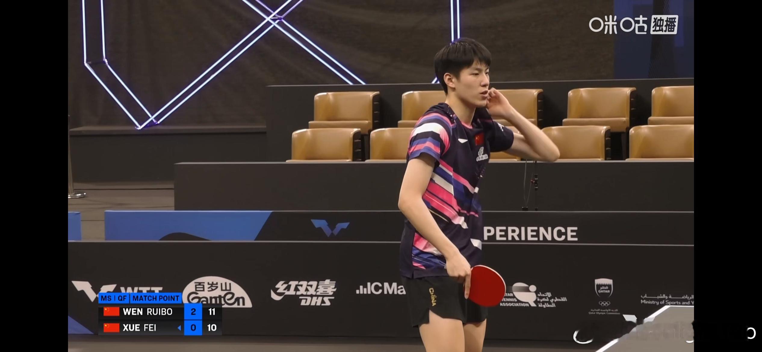 WTT球星挑战赛多哈站2026 男单1/4决赛:🇨🇳温瑞博3比1薛飞🇨🇳(11-6,11-2,12-14,11-6)温瑞博晋级男单4强