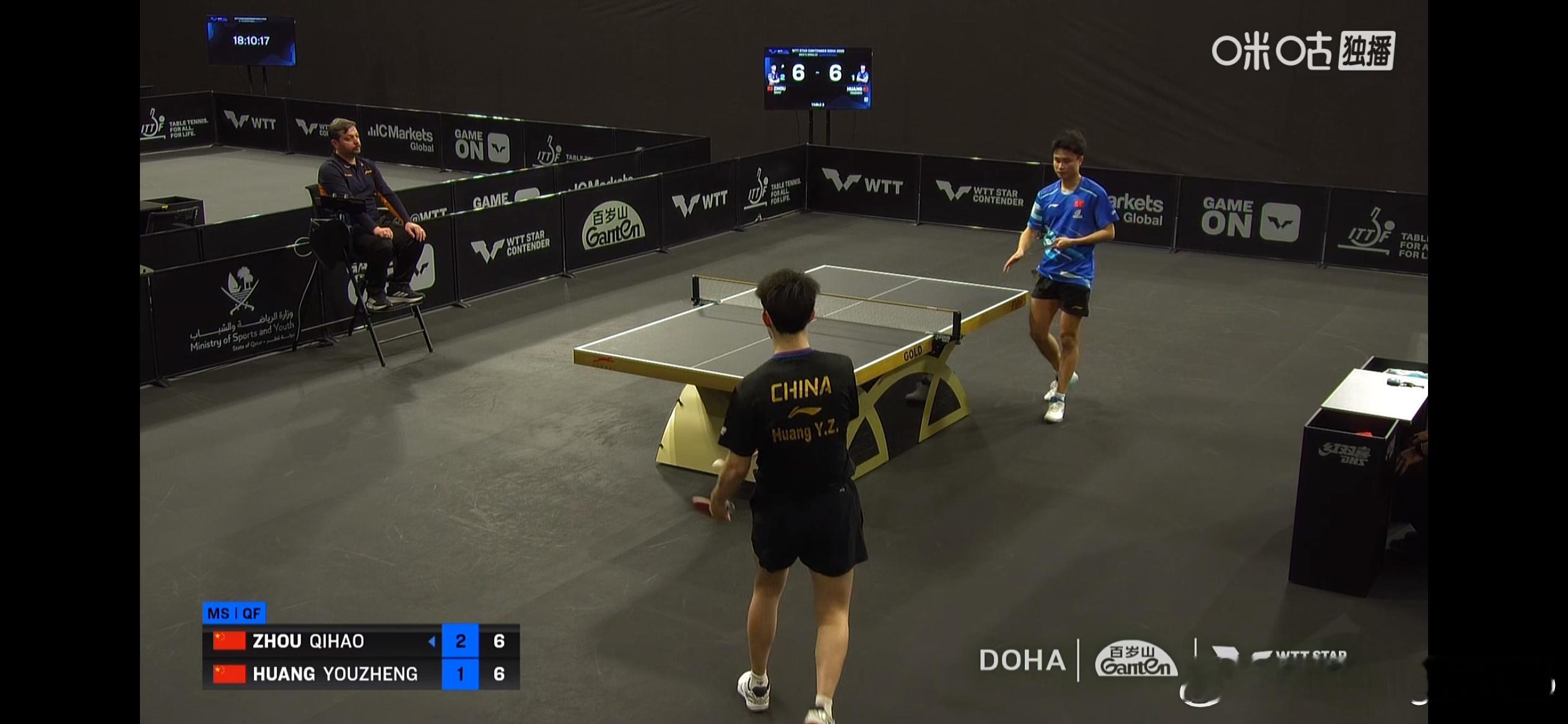 WTT球星挑战赛多哈站2026 男单1/4决赛:🇨🇳周启豪3比1黄友政🇨🇳(7-11,12-10,11-9,11-8)周启豪晋级男单4强
