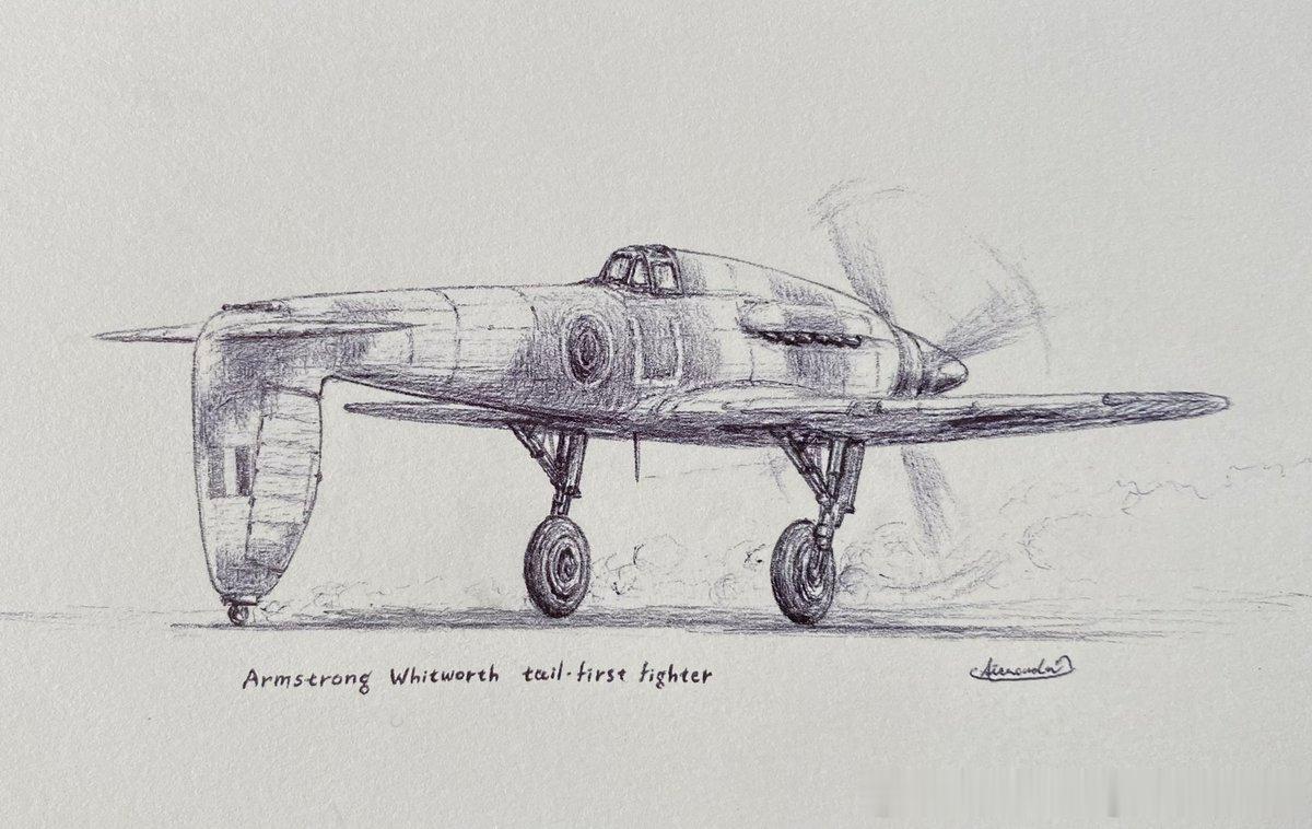 英国二战脑洞,阿姆斯特朗·惠特沃斯前翼式战斗机。作者Bell_airacuda37当你问英国飞机设计师,你设计的玩意还能再怪异一点吗?烽火问鼎计划 每天认识一件新兵器 他说,当然,我可以把飞机倒过来造一遍。前翼式战斗机(Tail-First Fighter)是英国阿姆斯特朗·惠特沃斯飞机公司在40年代初提出的一个高度前卫的战斗机设计方案。该方案旨在开发一种能够进行超高空作业并携带重型武装的战斗机。当时喷气推进技术尚在早期,设计师考虑将发动机置于机身后部,采用“鸭式布局”(前翼式),部分原因是为了避免喷气尾流干扰传统尾翼,并尝试解决高空飞行下的空气动力学问题。 该机采用鸭式布局设计,主翼位于后方,升降舵位于机头。这种布局在当时非常罕见,旨在提高大迎角下的机动性能和升力效率。最初计划搭载一台高空版劳斯莱斯梅林发动机作为过渡,待惠特尔喷气发动机量产后更换为喷气动力。该项目停留在设计图纸和风洞模型阶段,并未真正建造原型机。