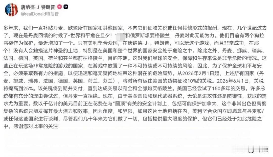 特朗普发文称,自2026年2月1日,要对丹麦、挪威、瑞典、法国、德国、英国、荷兰和芬兰向美国出口的所有商品征收10%的关税。2026年6月1日,关税将提高到25%,直到达成对格陵兰岛的收购为止。 特朗普给出的理由就是这些国家支持格陵兰岛,不让美国拥有该岛。 是不是挺魔幻的?前一阵刚威胁不能和伊朗做生意,否则就收关税。还没开始实施,这边就先给“盟友”上强度了。摊上这么一个“盟主”,这些个国家估计头都大了。
