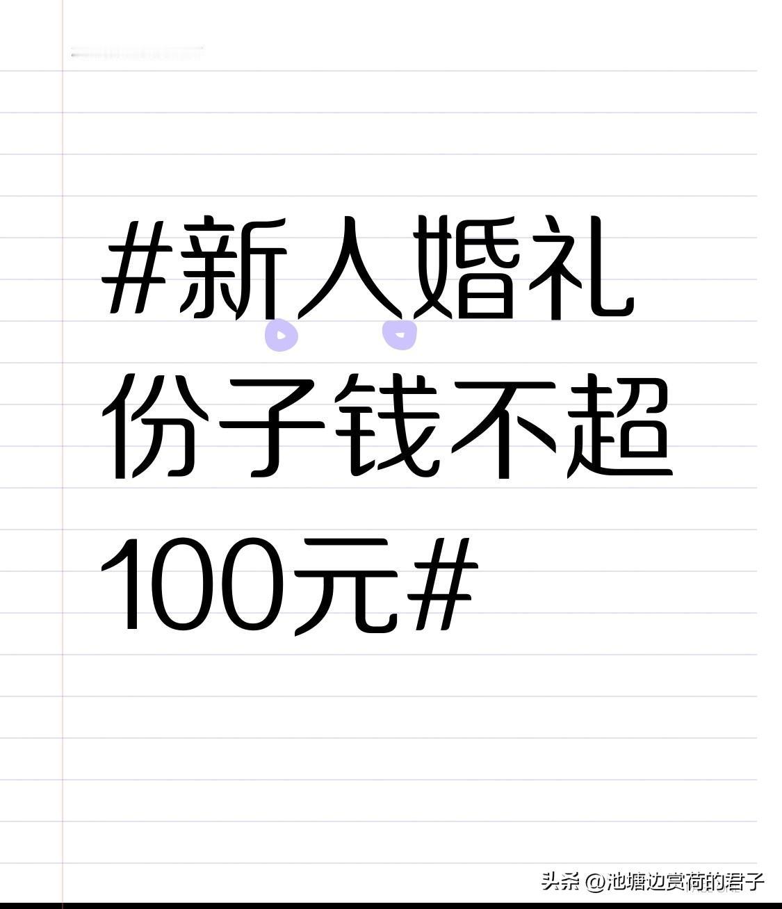 新人婚礼份子钱不超100元 广东中山这场新人婚礼太有新意了,主家邀请时特意注明礼金不超100元,还回礼10元。有宾客想多给,被新郎妈妈礼貌拒绝。 别看礼金收得少,婚宴规格却相当高,燕、鲍、翅、肚、参都安排上了。新郎新娘是校园情侣,双方家境优渥,父母白手起家事业成功还低调。新郎父亲说,办婚礼前商量过场地,孩子没追求盛大场面,他很认可。他们把通知发到每位来宾,就图大家能来一起乐呵,这婚礼办得既实在又温馨,值得点赞!