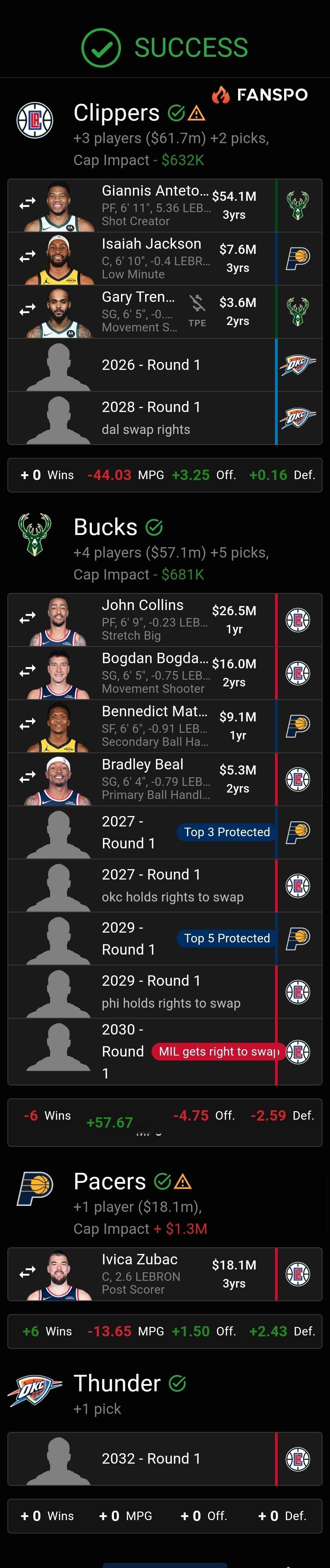 YY最终章:快船队先用2032年首轮与雷霆交易26年雷霆首轮、28年雷霆独行侠靠前首轮,填补球队未来首轮年限空缺,付出祖巴茨、科林斯、博格丹、比尔、27年船雷掘靠后首轮、29年前三保护的船费靠后首轮,交易得到字母、以赛亚杰克逊、特仑特; 雄鹿付出字母、特仑特,交易得到科林斯、博格丹、马瑟林、比尔、27年步行者前三保护首轮、27年船雷靠后首轮、29年步行者前五保护首轮、29年前三保护的船费靠后首轮、30年快船队首轮互换权; 步行者付出马瑟林、以赛亚杰克逊、27年前三保护首轮、29年前五保护首轮,交易得到祖巴茨。 敢赌吗?亏吗?