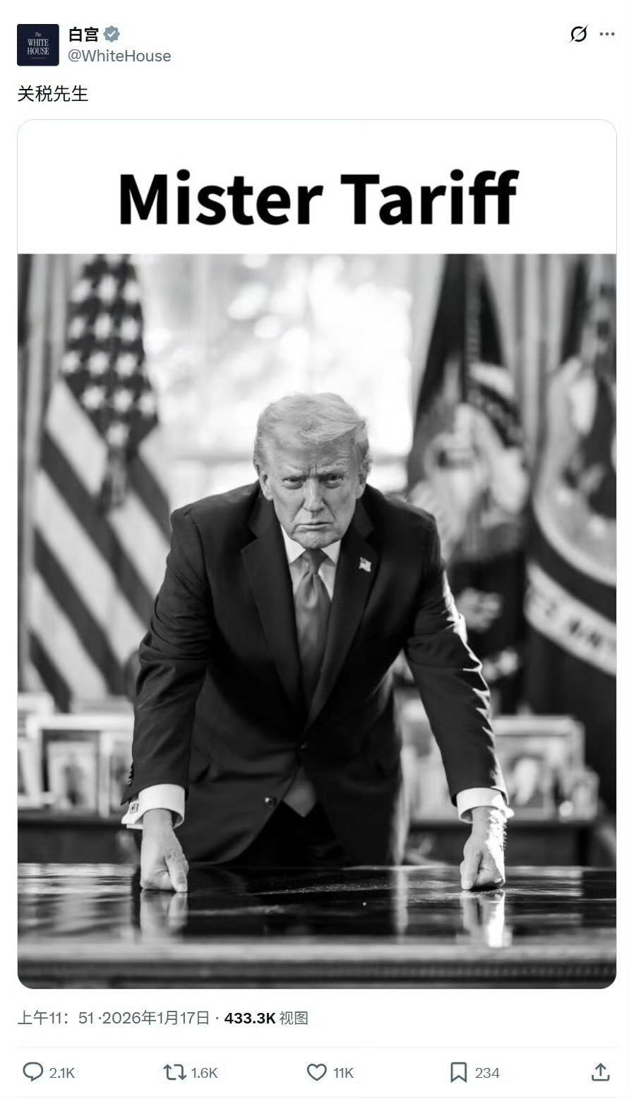 特朗普发文表示,将从2026年2月1号起,对向格陵兰岛派遣军队的8个欧洲国家,丹麦、挪威、瑞典、法国、德国、英国、荷兰以及芬兰(8个国家一共派了37人)征收10%的关税,并将在6月1号时提高至25%,且该关税将一直持续至美国完成格陵兰岛的收购为止。