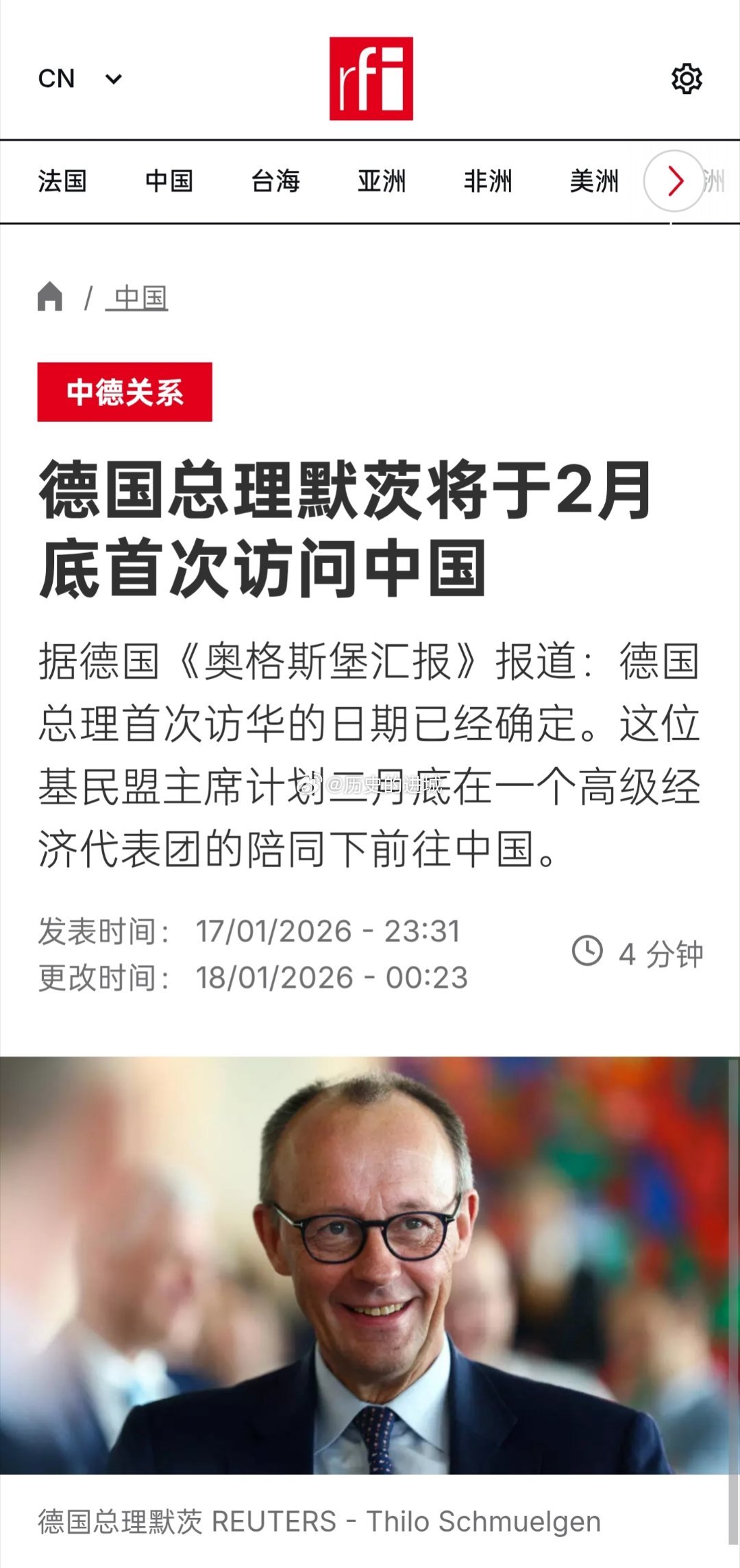 特朗普因格陵兰岛向欧洲8国加税据德国媒体报道,德国总理首次访华的日期已经确定。这位基民盟主席计划二月底在一个高级经济代表团的陪同下前往中国。根据向德国企业家发出的邀请函显示,初步行程安排计划于2026年2月24日至27日进行。