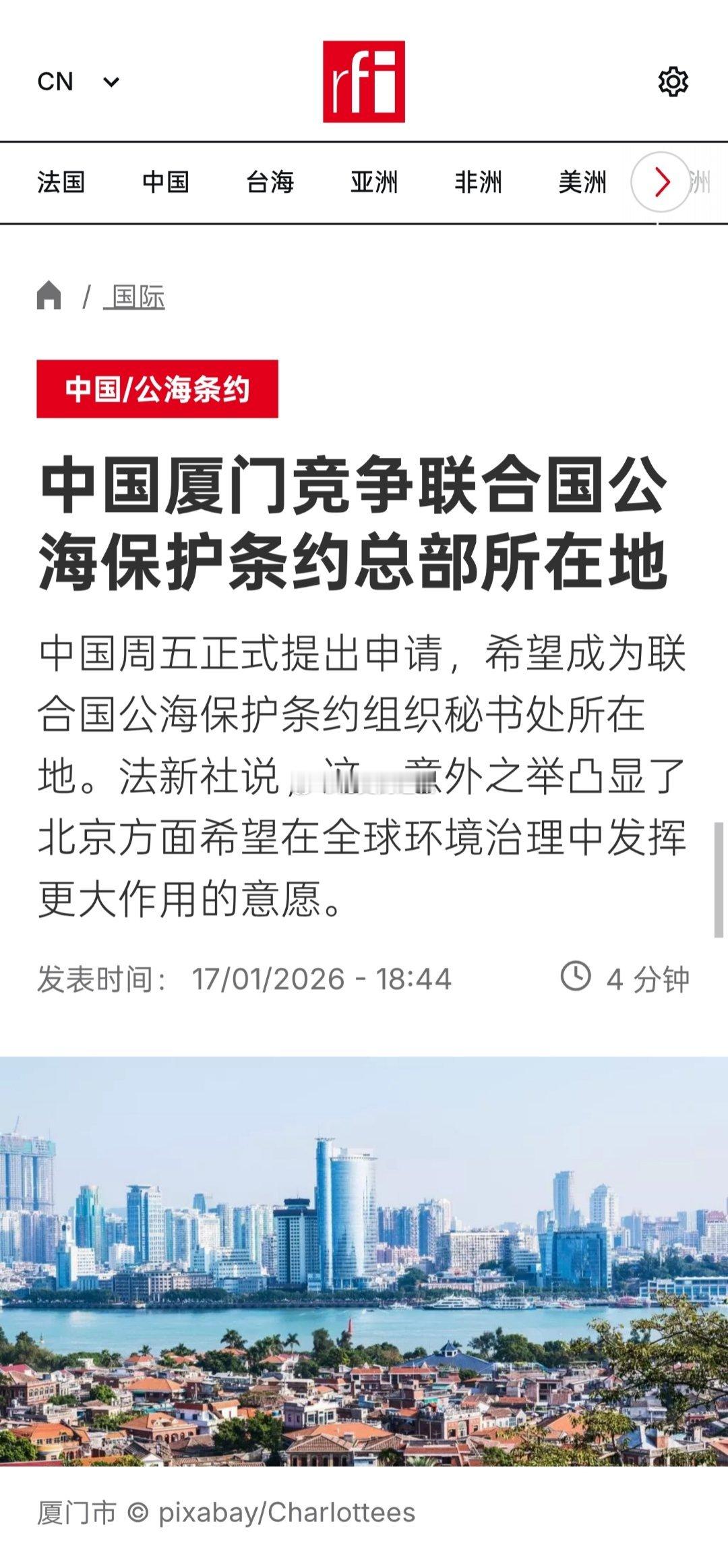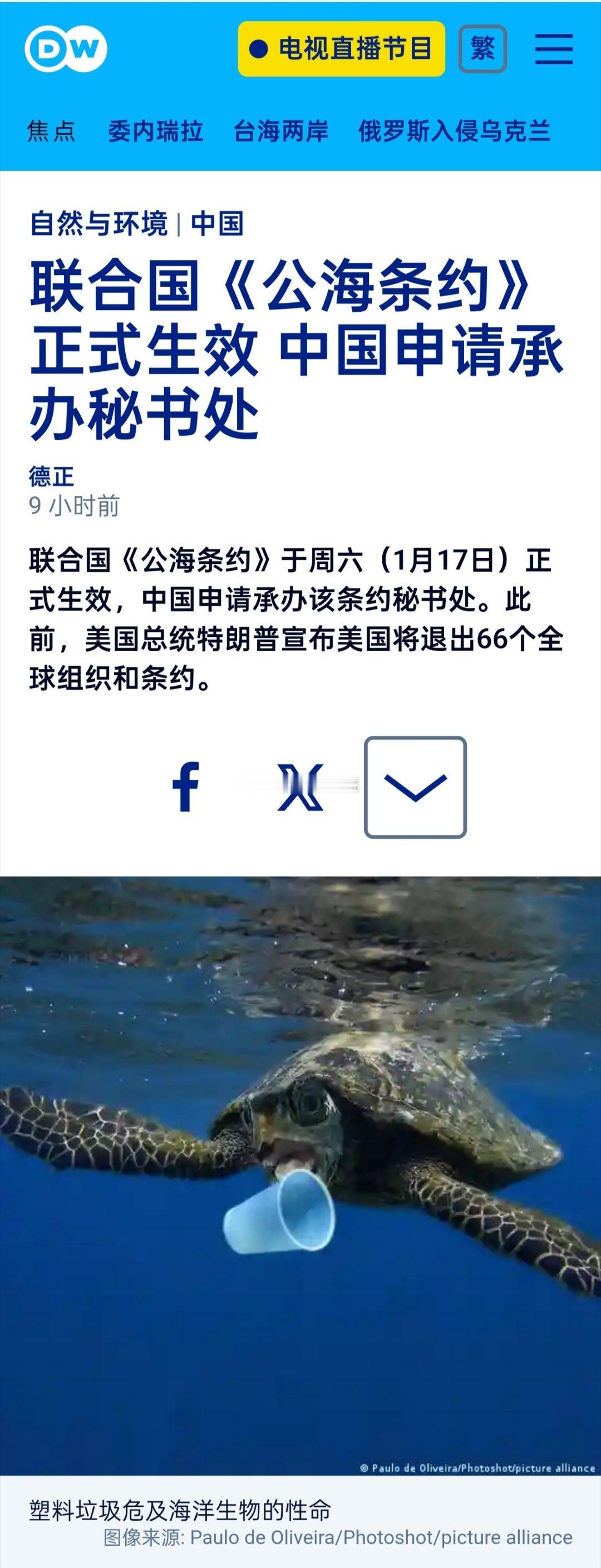 联合国《公海条约》于周六(1月17日)正式生效,中国申请承办该条约秘书处。此前,美国总统特朗普宣布美国将退出66个全球组织和条约。中国驻联合国代表团在致联合国秘书长古特雷斯的一份信件中说:“中国已决定推荐厦门市承办这一条约秘书处”。在历经近二十年的谈判后,联合国《公海条约》的施行被视为海洋保护事业的历史性里程碑。该条约在去年9月获得60个国家批准、达到生效门槛后的120天正式生效。截至周五(1月16日),已有83个国家批准,其中包括近期加入的中国、日本等主要海洋国家。保护公海新条约的成员国将于3月在纽约进行谈判,以期在一年内制定条约并组织首次缔约方会议,即首届海洋“COP”会议。