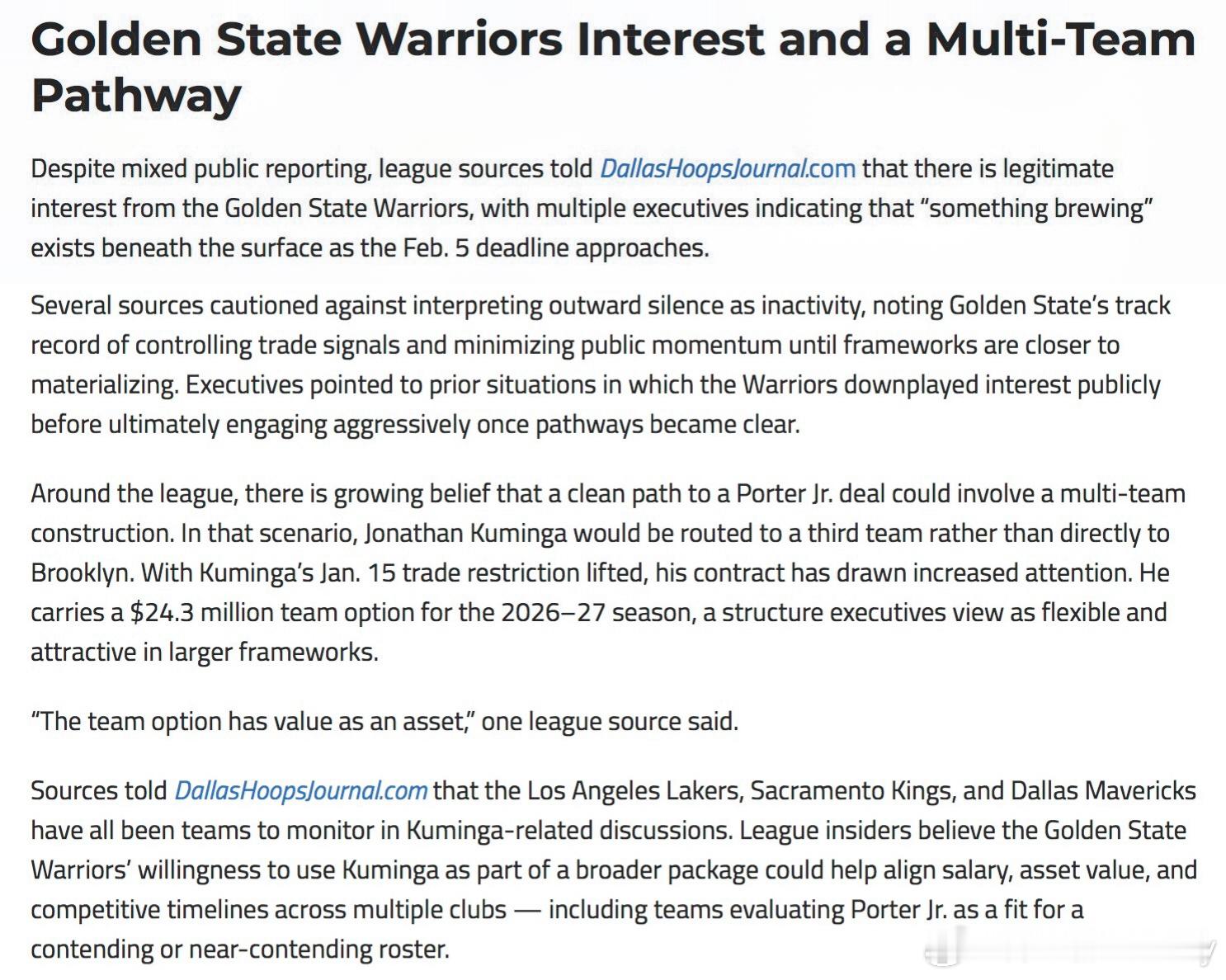 Grant Afseth:勇士对小迈克尔·波特确实有兴趣,且背后有事情正在酝酿。报道称,尽管公开报道内容不一,但消息来源告诉《达拉斯篮球日志》,勇士对小波特有着真正的兴趣。消息来源还提醒,勇士喜欢控制交易信号——擅长公开淡化兴趣,最终在路径清晰时强势介入。库明加合同第二年的球队选项很有价值,联盟中越来越多人相信,小波特的交易将涉及多队,其中库明加会送到第三方而不是篮网,湖人,国王和独行侠都是值得关注的球队。