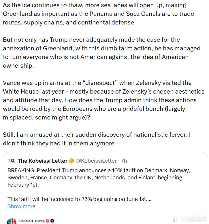 美国历史上曾多次尝试购买格陵兰岛:• 1867–1868年,在总统安德鲁·约翰逊和国务卿威廉·休厄德(成功购买了阿拉斯加)时期• 1910年,在总统威廉·塔夫脱时期• 1946年,在总统哈里·杜鲁门时期• 1955年,在总统德怀特·艾森豪威尔时期丹麦从未热衷于出售格陵兰。现实情况是,对于美国、格陵兰、丹麦、欧盟以及北约来说,美国获取格陵兰实际上有诸多好处,因为格陵兰处于战略要地,因此在海军和导弹防御方面发挥重要作用,而这部分负担本来就主要落在美国肩上。冷战期间,美国在格陵兰驻扎了15000名军队,以防御领土遭到攻击,并扫描北极和大西洋的苏联舰船和潜艇。随着冰层持续融化,更多航道将被打开,使格陵兰在贸易航线、供应链和大陆防御中的重要性可与巴拿马运河和苏伊士运河相比。但特朗普不仅从未充分阐明吞并格陵兰的理由,这一愚蠢的关税行动还让所有非美国人反对美国拥有格陵兰的想法。去年泽连斯基访问白宫时,万斯因“对泽连斯基的不尊重”大为愤怒——主要是因为泽连斯基当天选择的审美和态度。特朗普政府如何认为这些行为会被自尊心强(尽管有些可能过于自负)的欧洲人解读呢?不过,我对他们突然发现的民族主义热情感到有些好笑。我原以为他们已经没有这种热情了。