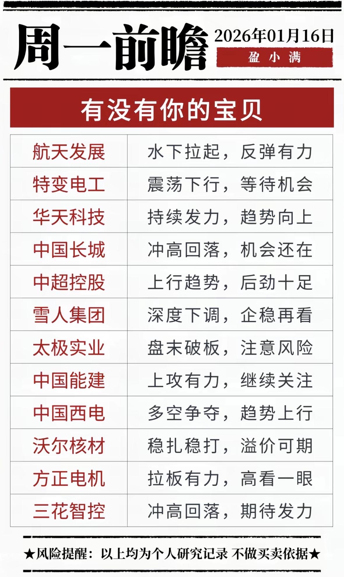 2026年1月16日周一小前瞻:哪些股票值得关注? 多股轮动上攻,尾盘抢筹显强势,部分反包新高,但需警惕回落风险,快进快出把握节奏。 多只科技股异动拉升,短线或迎转机,注意高位回落风险,快进快出为主。